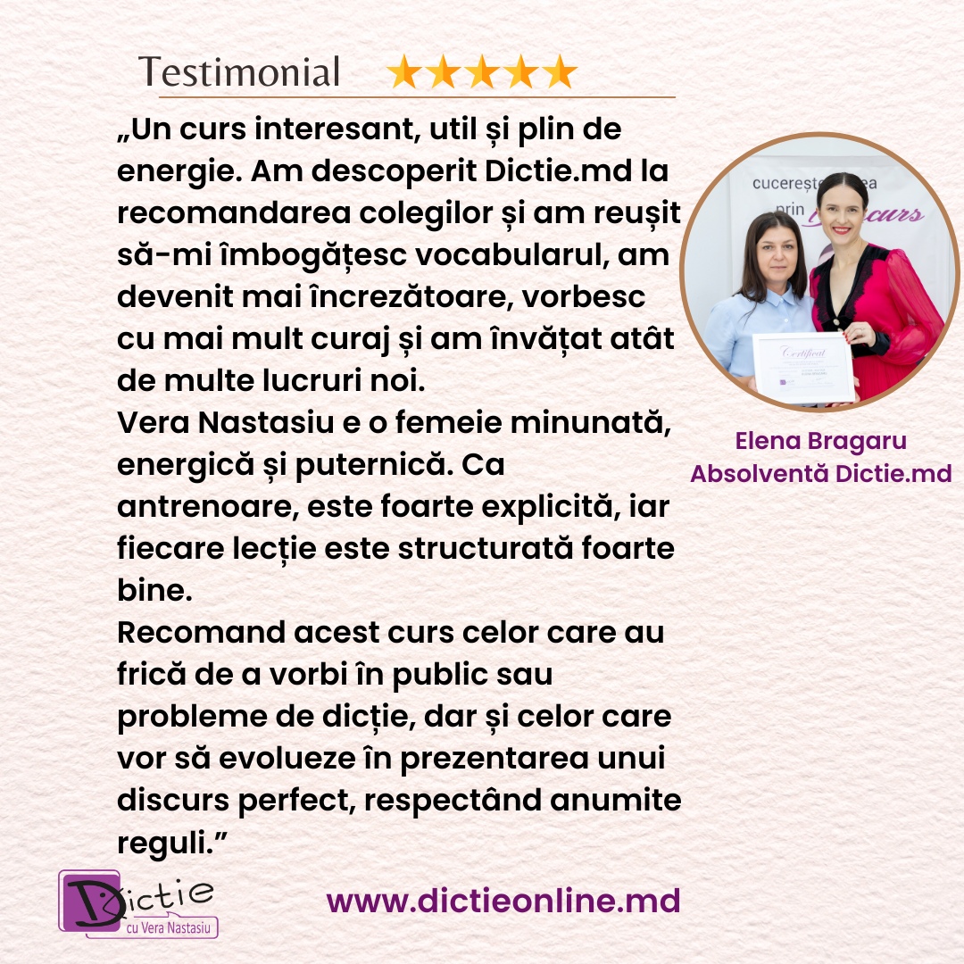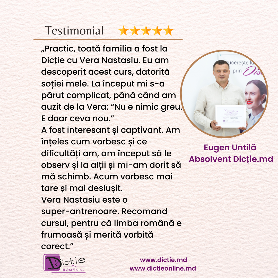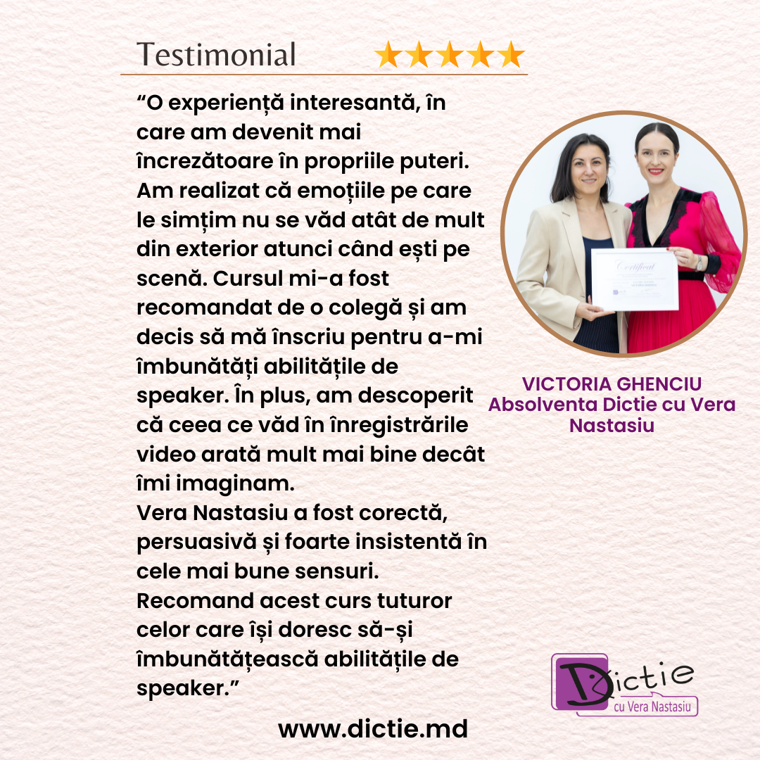 Rezultatele noastre le găsiți și pe canalul nostru oficial de Youtube sau LinkedIn: Vera Nastasiu, iar pe Facebook și Instagram: Dicție.md.
