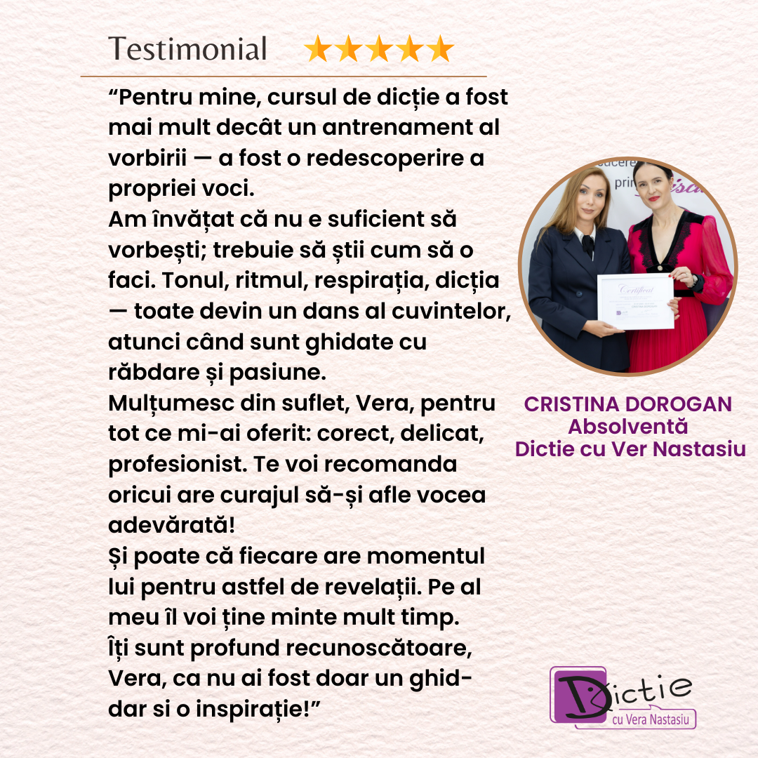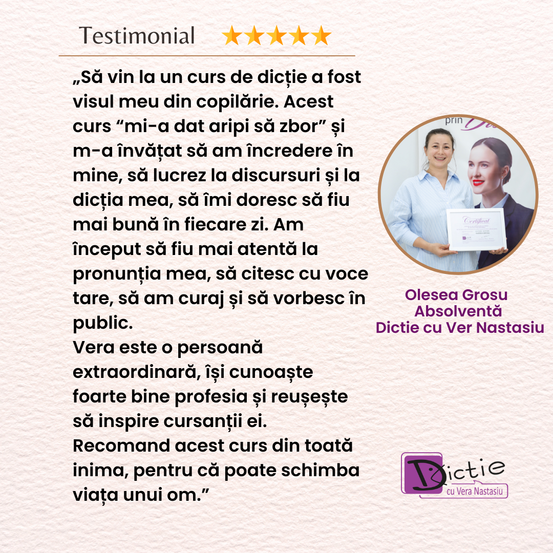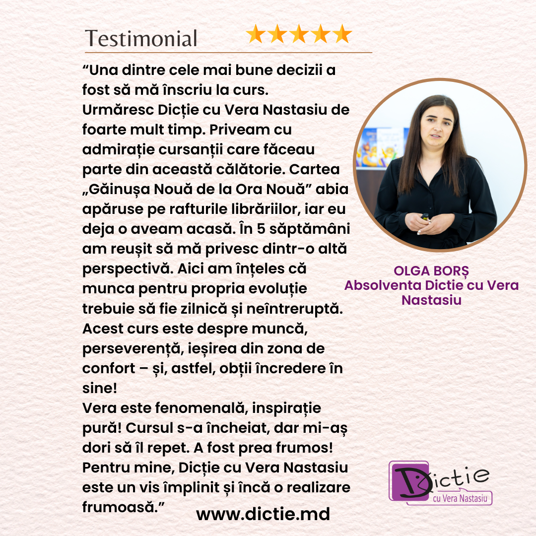Rezultatele noastre le găsiți și pe canalul nostru oficial de Youtube sau LinkedIn: Vera Nastasiu, iar pe Facebook și Instagram: Dicție.md.