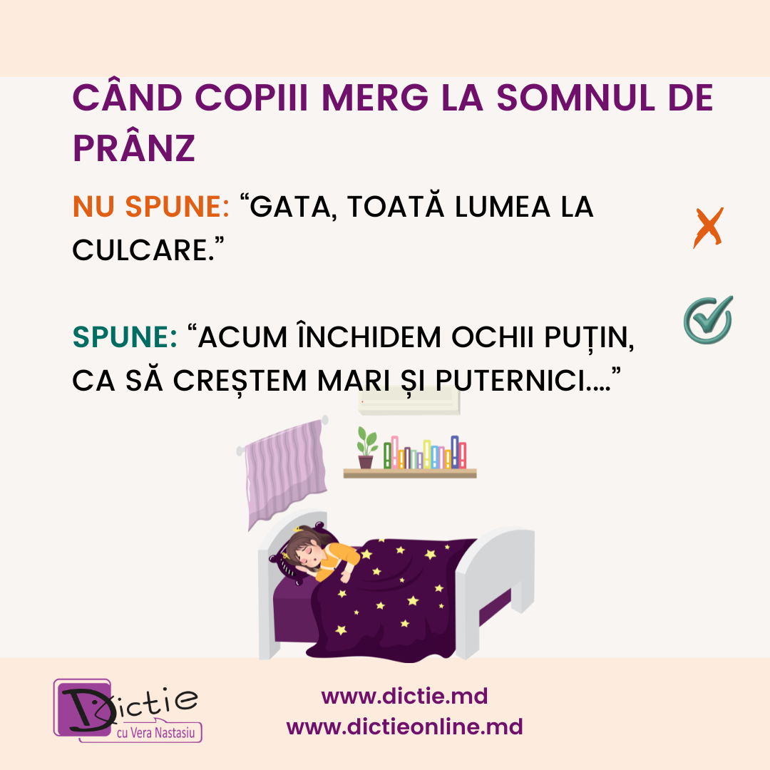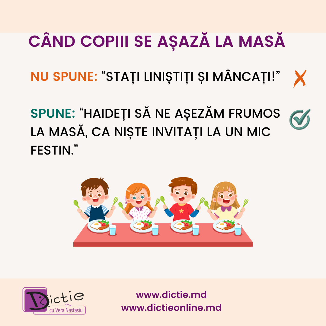 Această formulare simplă schimbă atmosfera. Copiii nu mai simt că primesc o comandă, ci că participă la un moment organizat, plăcut, aproape ceremonial.