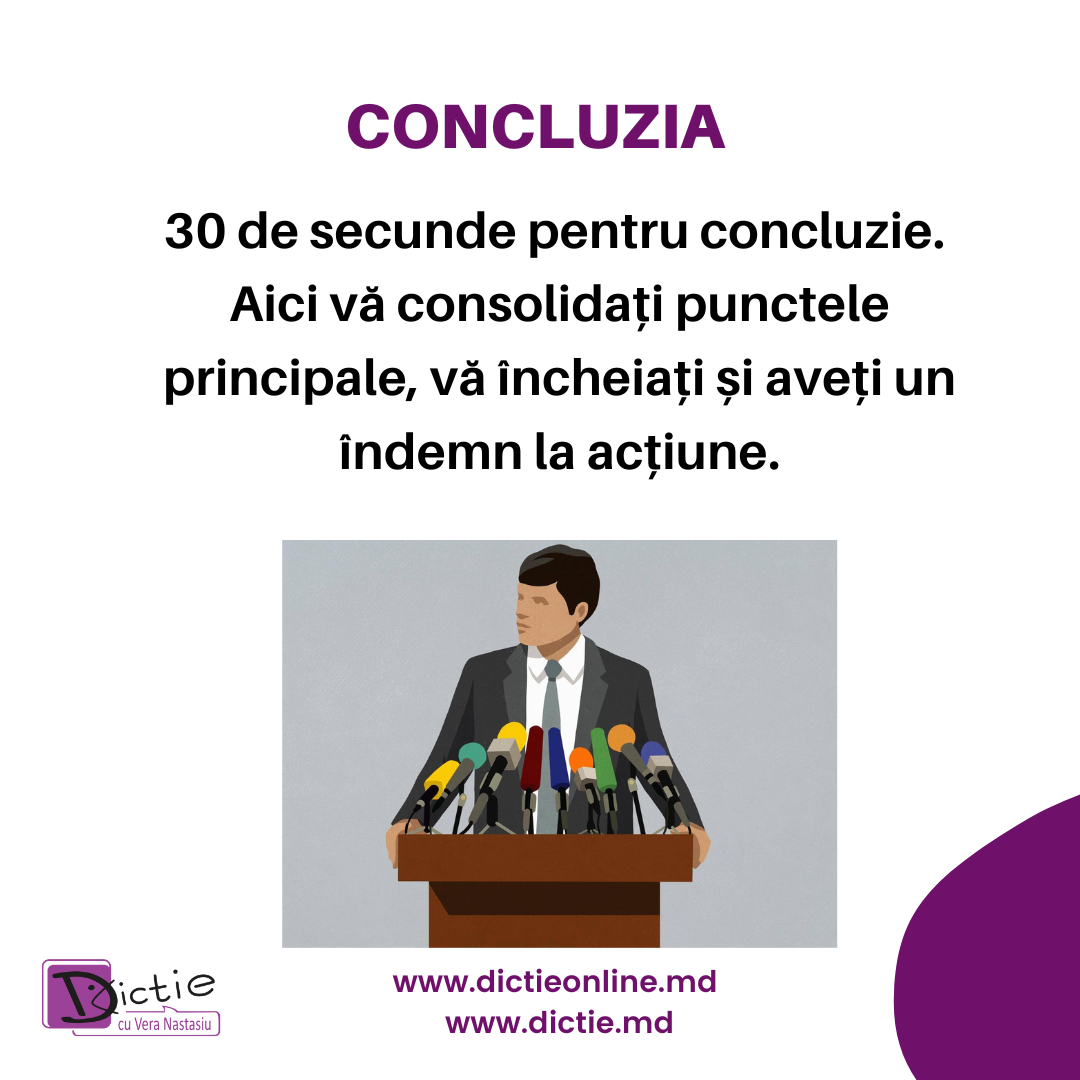• Încheiere (1 minut): Rezumă punctele cheie și oferă o concluzie puternică. Poți încheia cu un apel la acțiune, o întrebare provocatoare sau o imagine mentală care să rămână cu publicul.