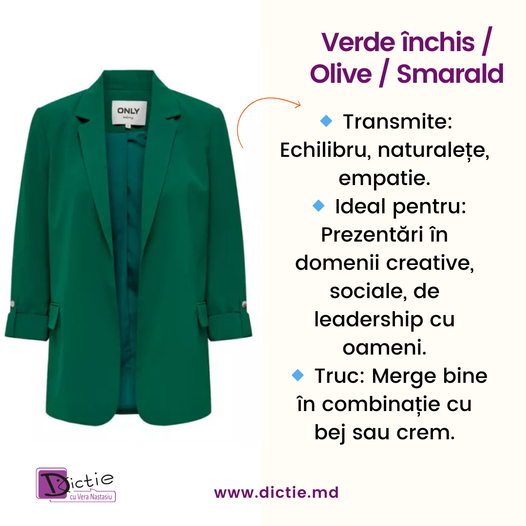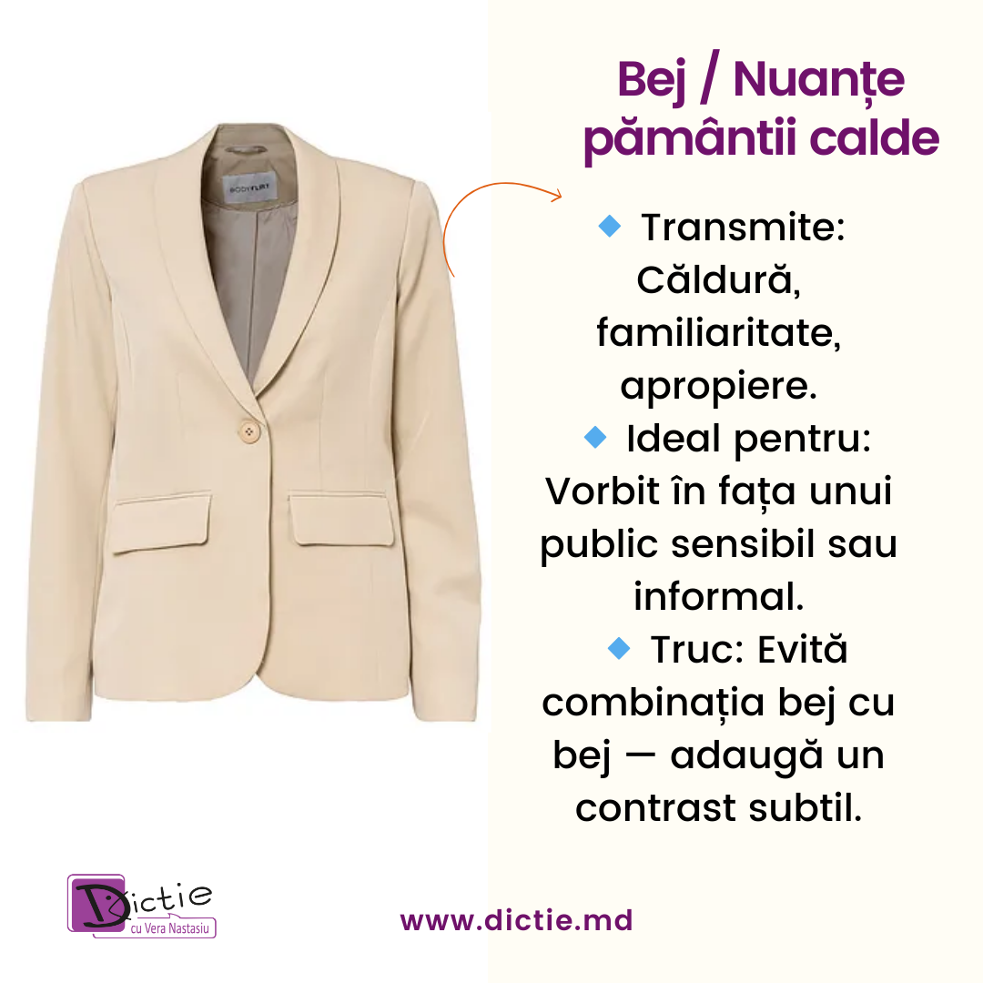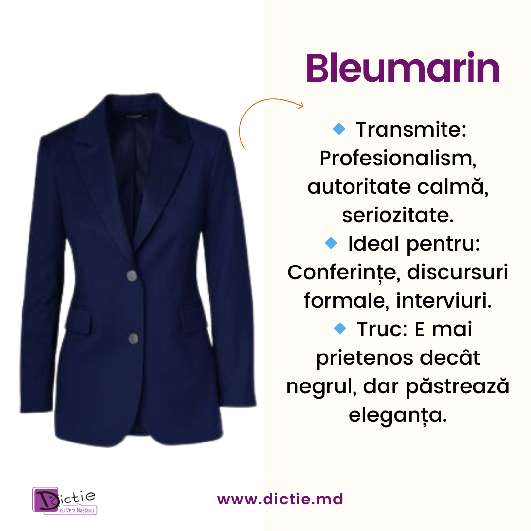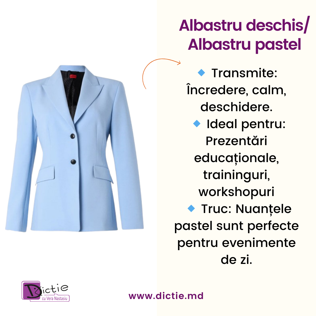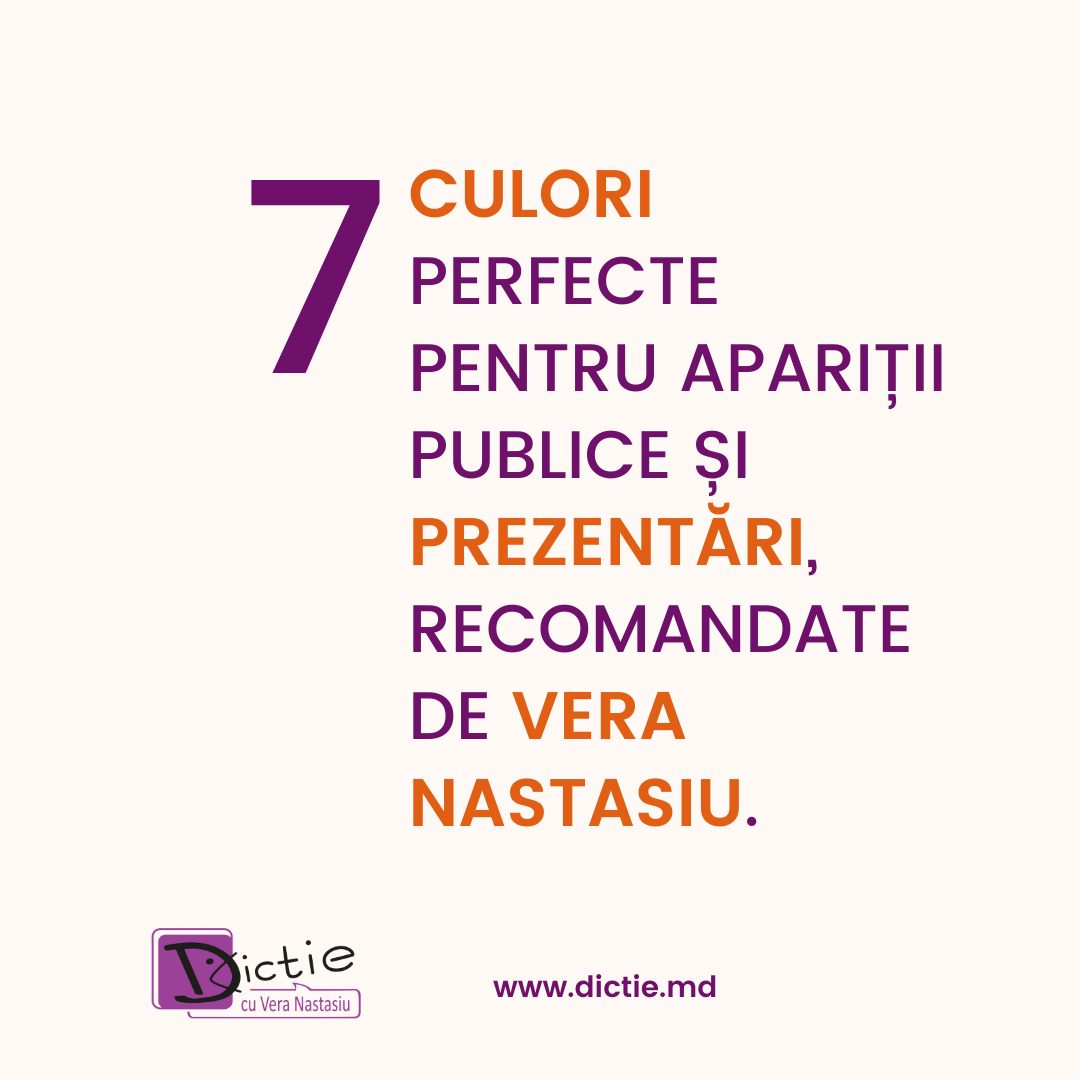 Antrenoarea de dicție și discurs public, Vera nastasiu spune la cursurile sale că, culorile pe care le porți în apariții publice sau în timpul discursurilor joacă un rol esențial în percepția publicului despre tine. Ele pot transmite încredere, profesionalism, căldură, autoritate sau deschidere. Iată o listă cu culorile perfecte pentru apariții publice și prezentări, însoțite de semnificația și impactul lor psihologic: