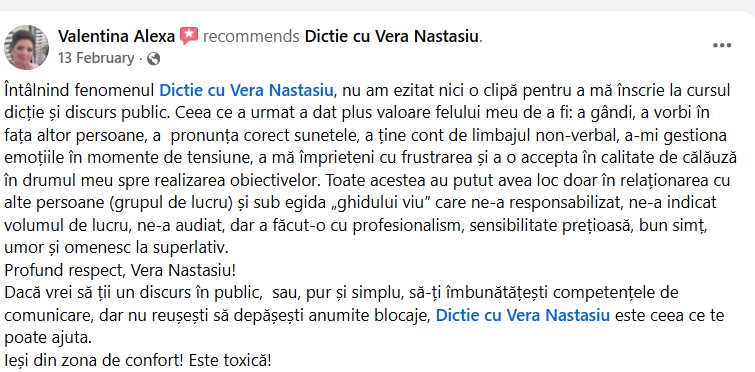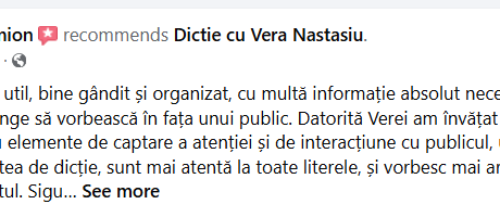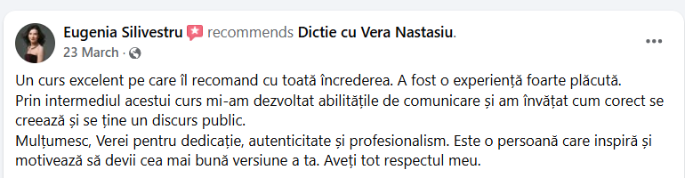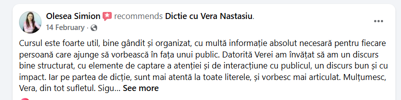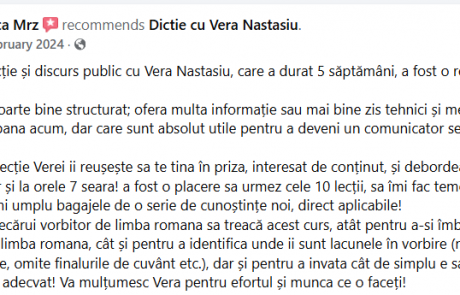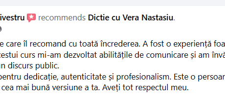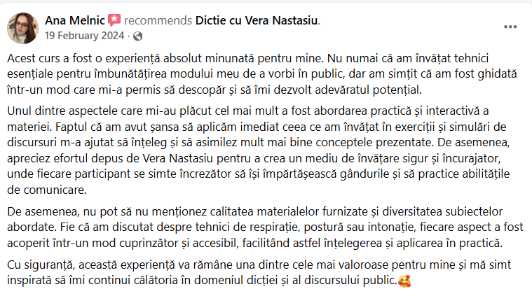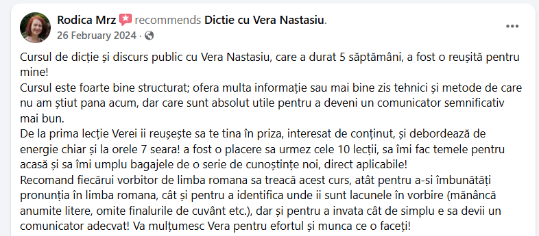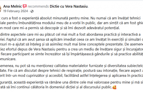 Cursul se adresează persoanelor care prin natura muncii lor trebuie să aibă un discurs clar, corect și cursiv și care doresc să își îmbunătățească abilitățile de vorbire. Alege acest curs dacă…