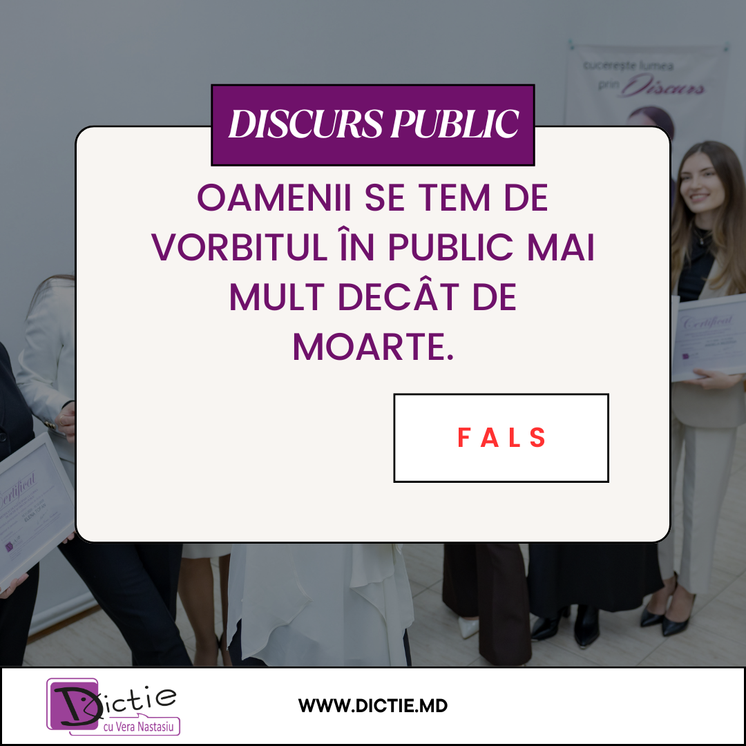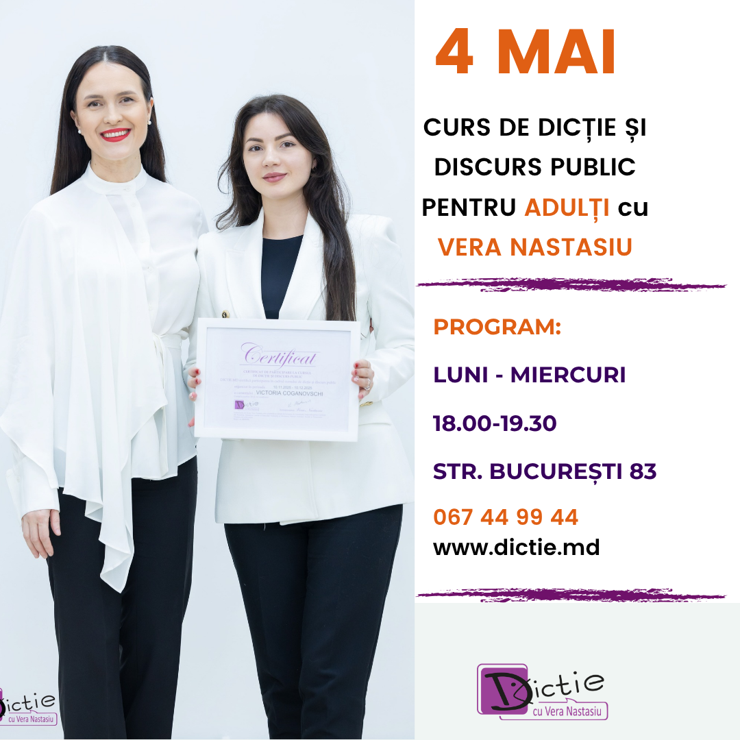 Din 4 Mai, ne vedem la cursul de dicție și discurs public cu Vera Nastasiu. Detalii la 067 44 99 44 sau aici la sectiunea cursuri.