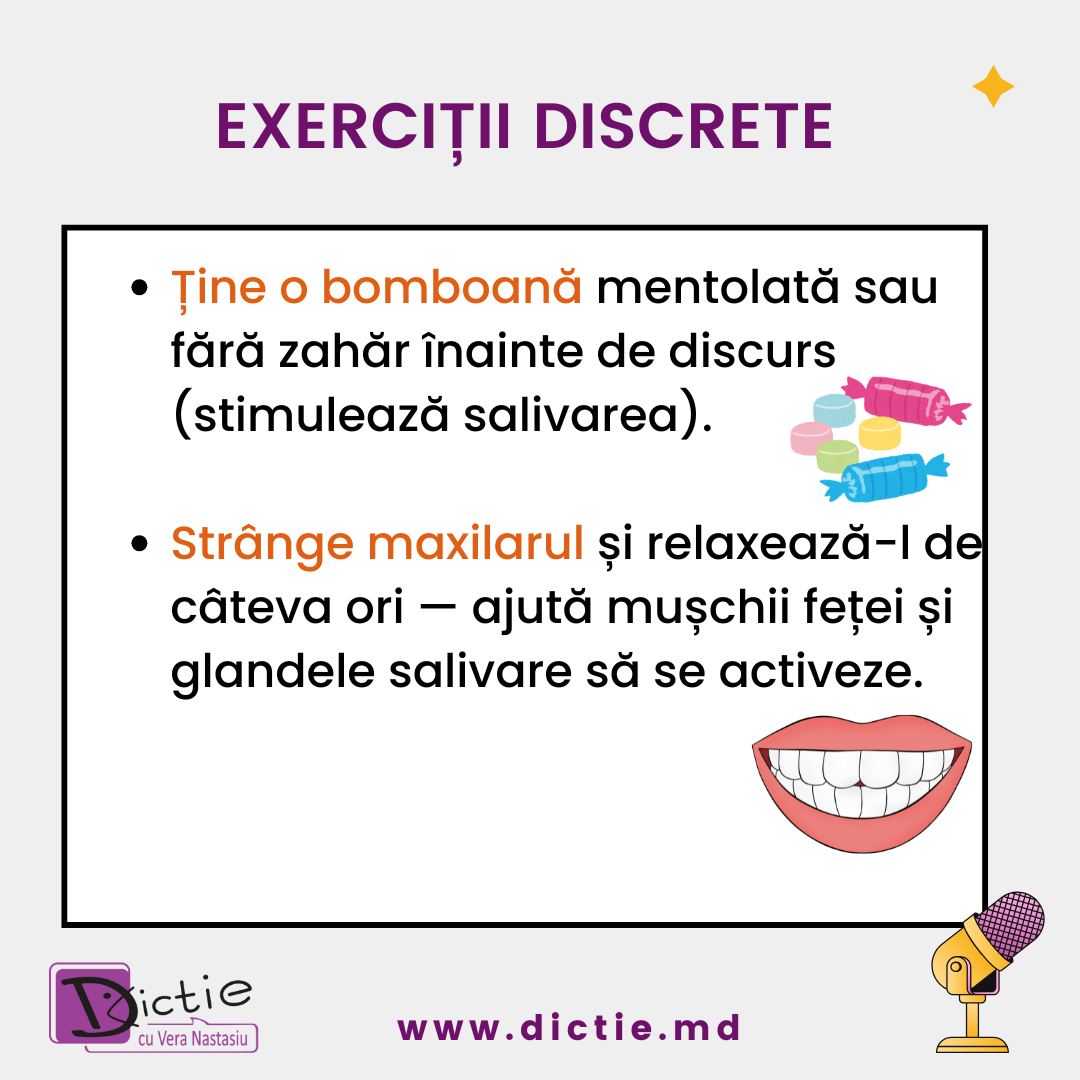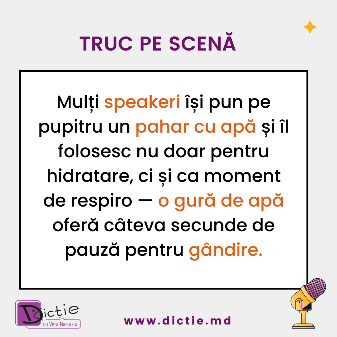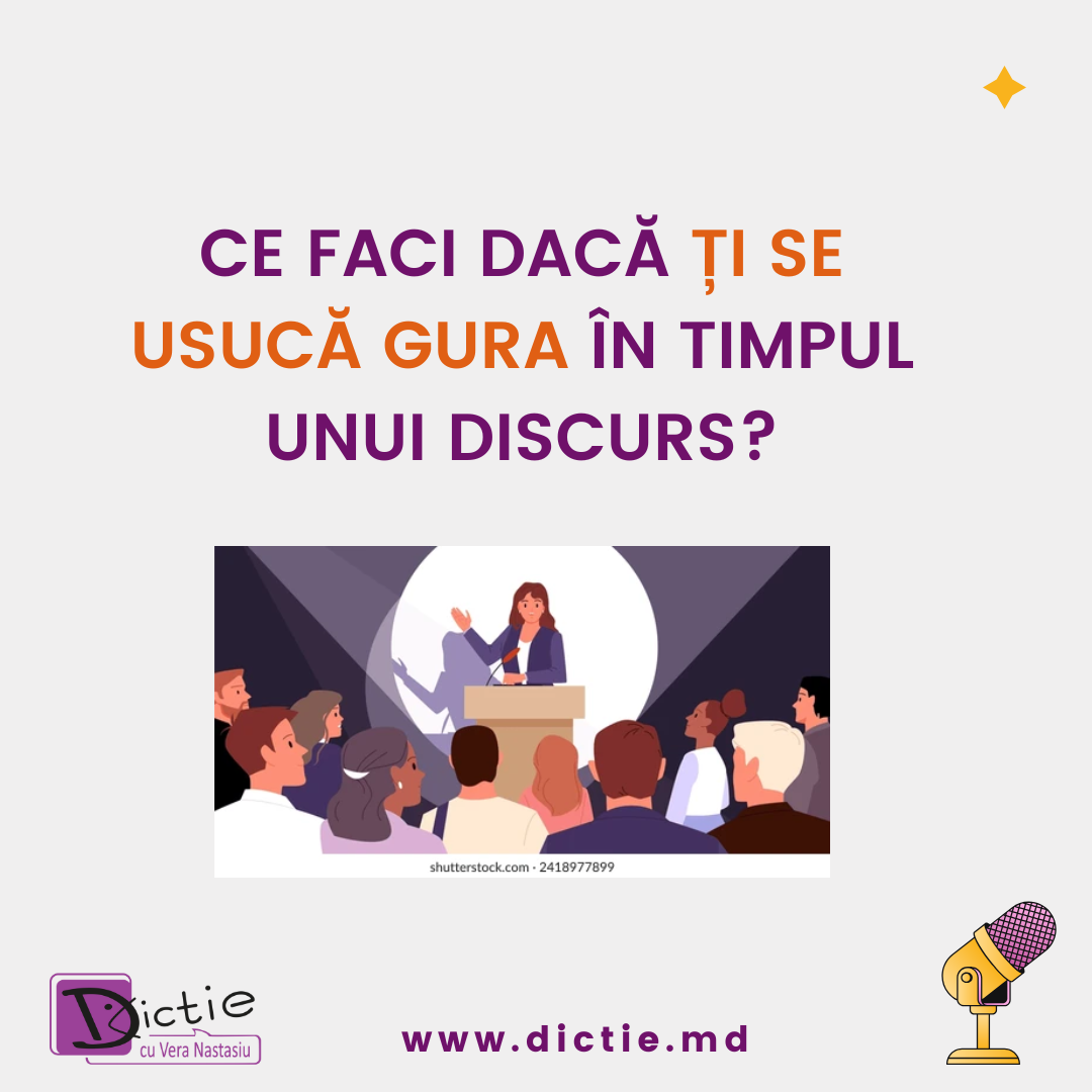 Ține o bomboană mentolată sau fără zahăr înainte de discurs – stimulează salivarea.
