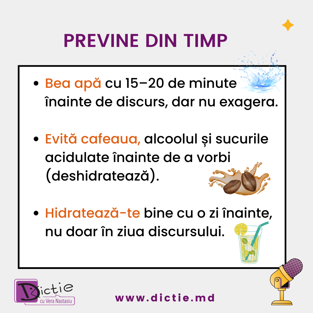 Bea apă cu 15–20 de minute înainte de discurs, dar nu exagera.