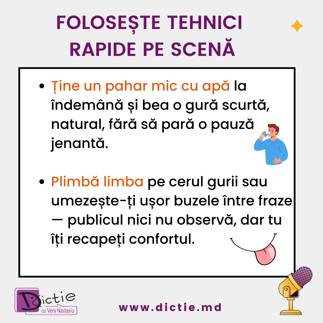 Plimbă limba pe cerul gurii sau umezește-ți ușor buzele între fraze – publicul nici nu observă, dar tu îți recapeți confortul.