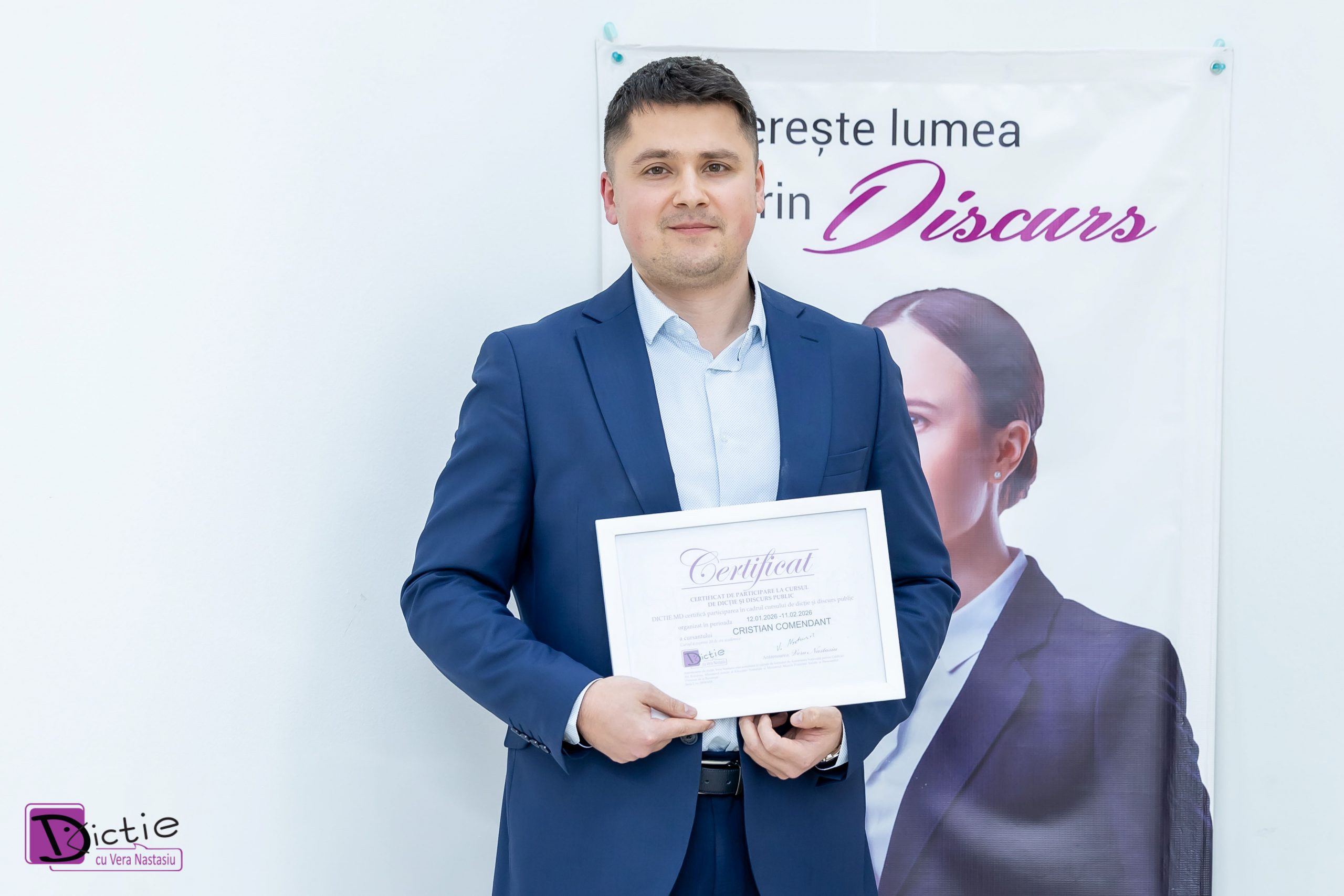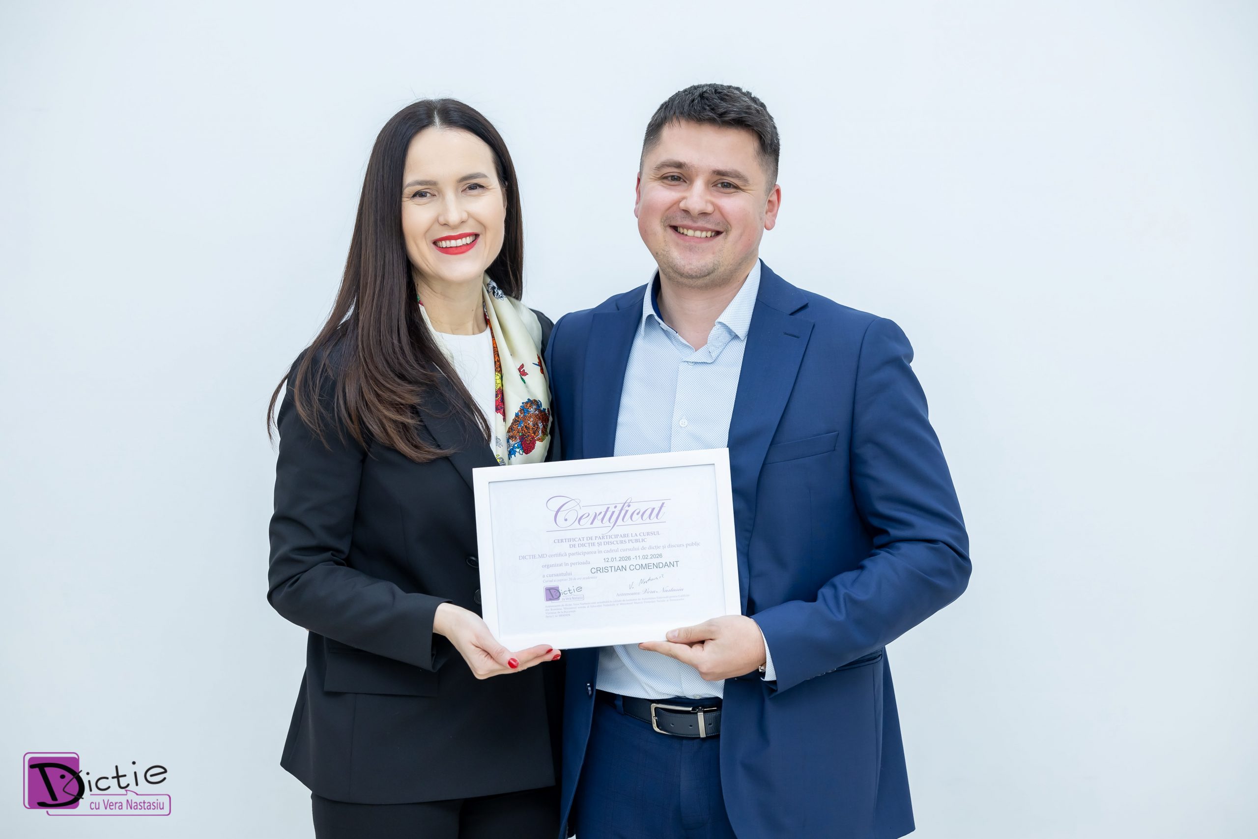 „Am avut o deosebită plăcere să fiu prezent aici și să-mi perfecționez abilitățile de comunicare – dicția și modul de pronunție corectă. Am învățat tehnici noi privind structura unui discurs public și limbajul corpului. Doamna Vera, sunteți fenomenală. Mi-aș dori să am și eu măcar 20% din energia dumneavoastră. Recomand acest curs pentru că te învață lucruri care ne permit să fim încrezători imediat în cazul în care trebuie să susții un discurs public.”