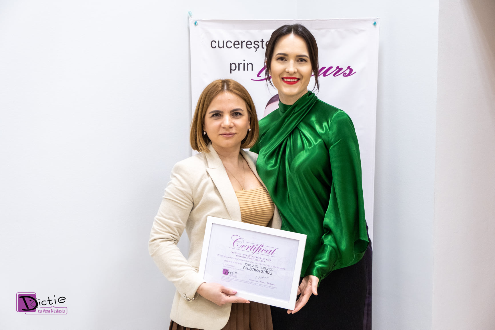 Cristina Spînu este un exemplu demn de urmat, prin maniera și modul ei exemplar de comunicare. Ne-am bucurat să punem umărul la împlinirea unui obiectiv și să avem succes împreună la dicție și discurs public.