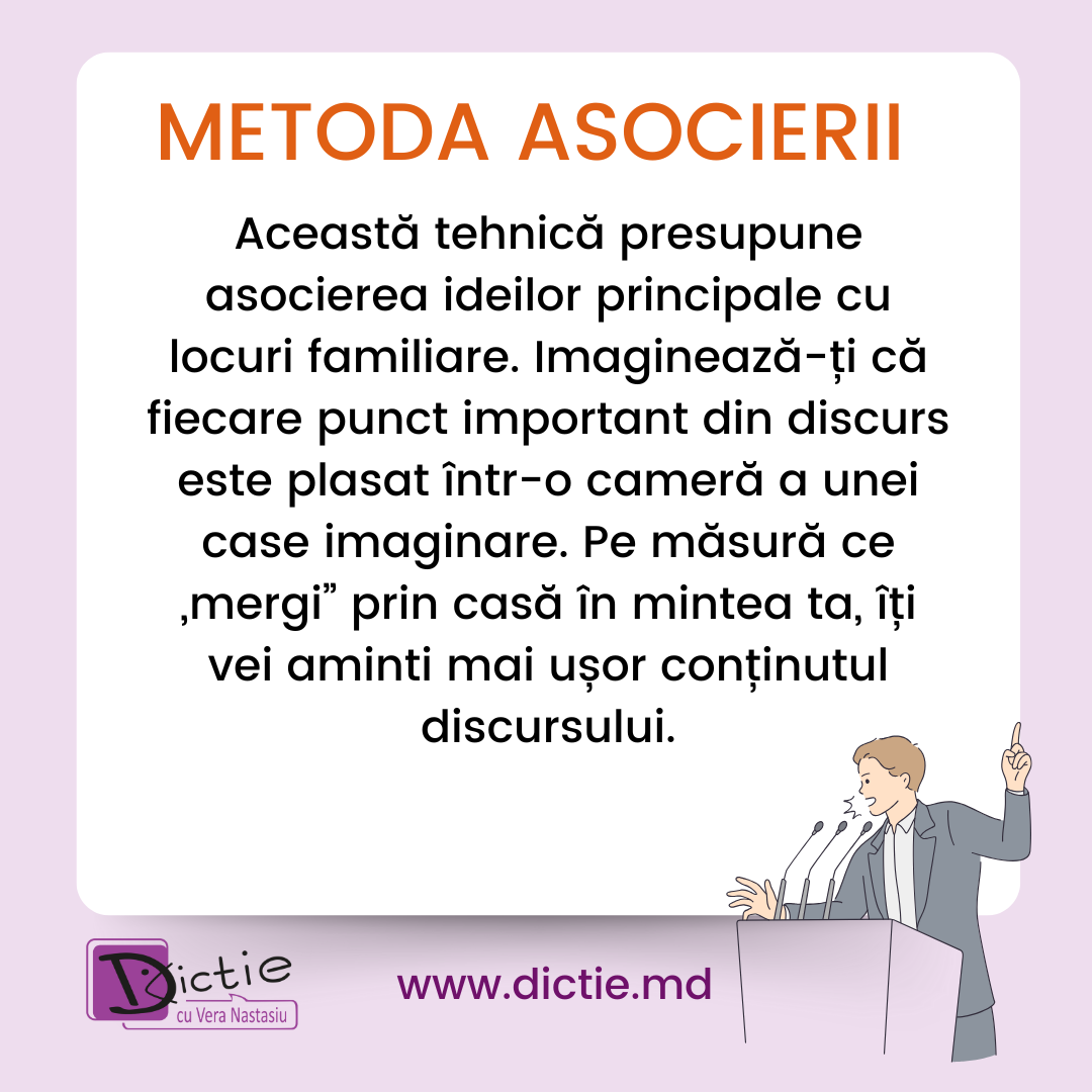 Această tehnică, utilizată de marii oratori ai Antichității, presupune să asociezi fiecare parte a discursului cu un loc familiar. Imaginează-ți că fiecare idee principală este plasată într-o cameră a casei tale. Pe măsură ce îți „plimbi” mintea prin camere, îți vei aminti mai ușor conținutul.