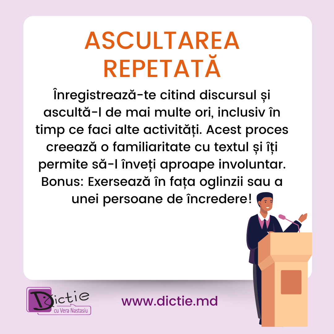 Vocea ta este un instrument puternic! Înregistrează discursul pe telefon și ascultă-l de câteva ori pe zi. Memoria auditivă va face minuni, iar în timp vei observa că îți amintești frazele mai ușor.