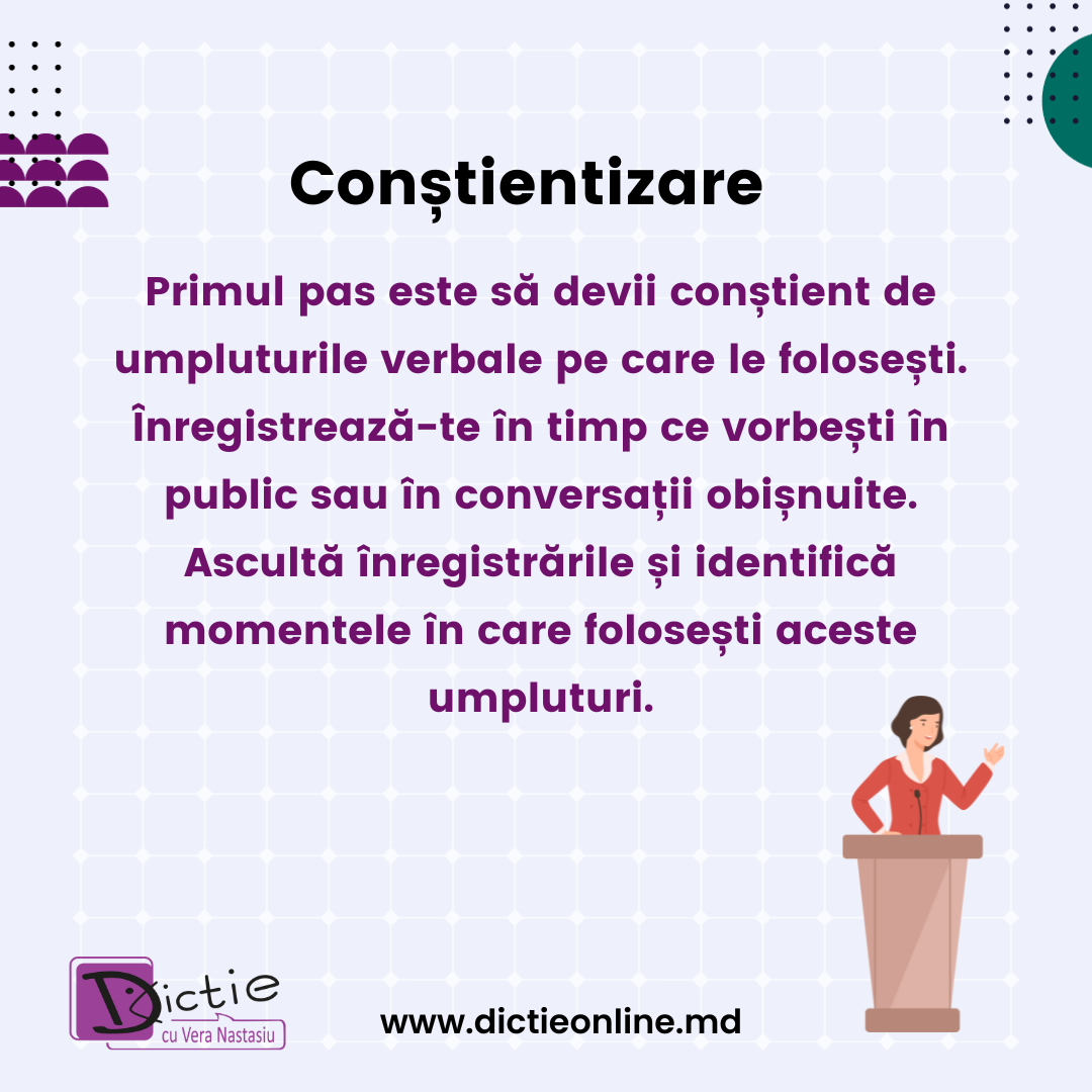 - Conștientizare: Primul pas este să devii conștient de umpluturile verbale pe care le folosești. Înregistrează-te în timp ce vorbești în public sau în conversații obișnuite. Ascultă înregistrările și identifică momentele în care folosești aceste umpluturi.