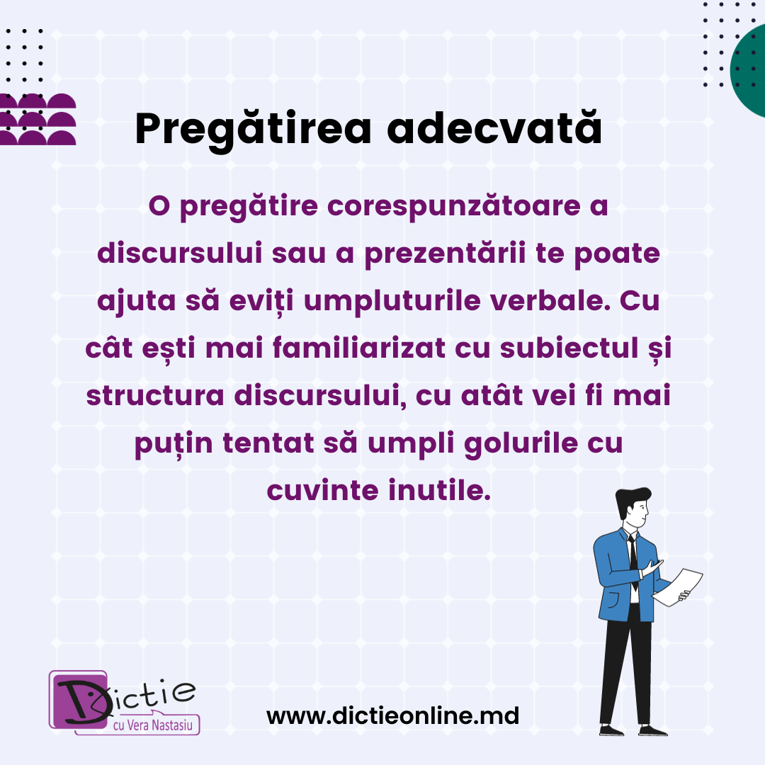- Pregătirea adecvată: O pregătire corespunzătoare a discursului sau a prezentării te poate ajuta să eviți umpluturile verbale. Cu cât ești mai familiarizat cu subiectul și structura discursului, cu atât vei fi mai puțin tentat să umpli golurile cu cuvinte inutile.