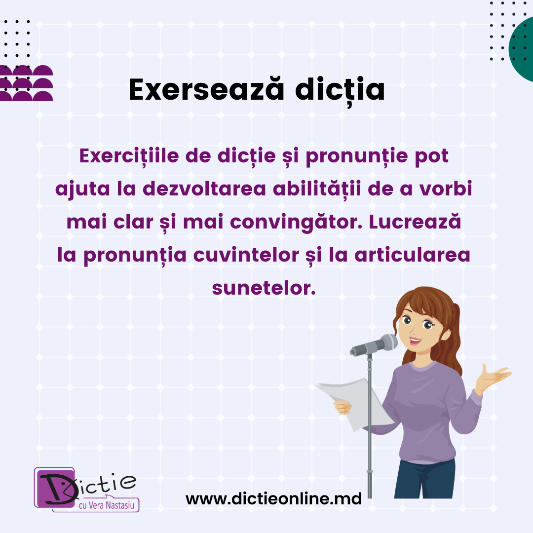 - Exersează dicția: Exercițiile de dicție și pronunție pot ajuta la dezvoltarea abilității de a vorbi mai clar și mai convingător. Lucrează la pronunția cuvintelor și la articularea sunetelor.