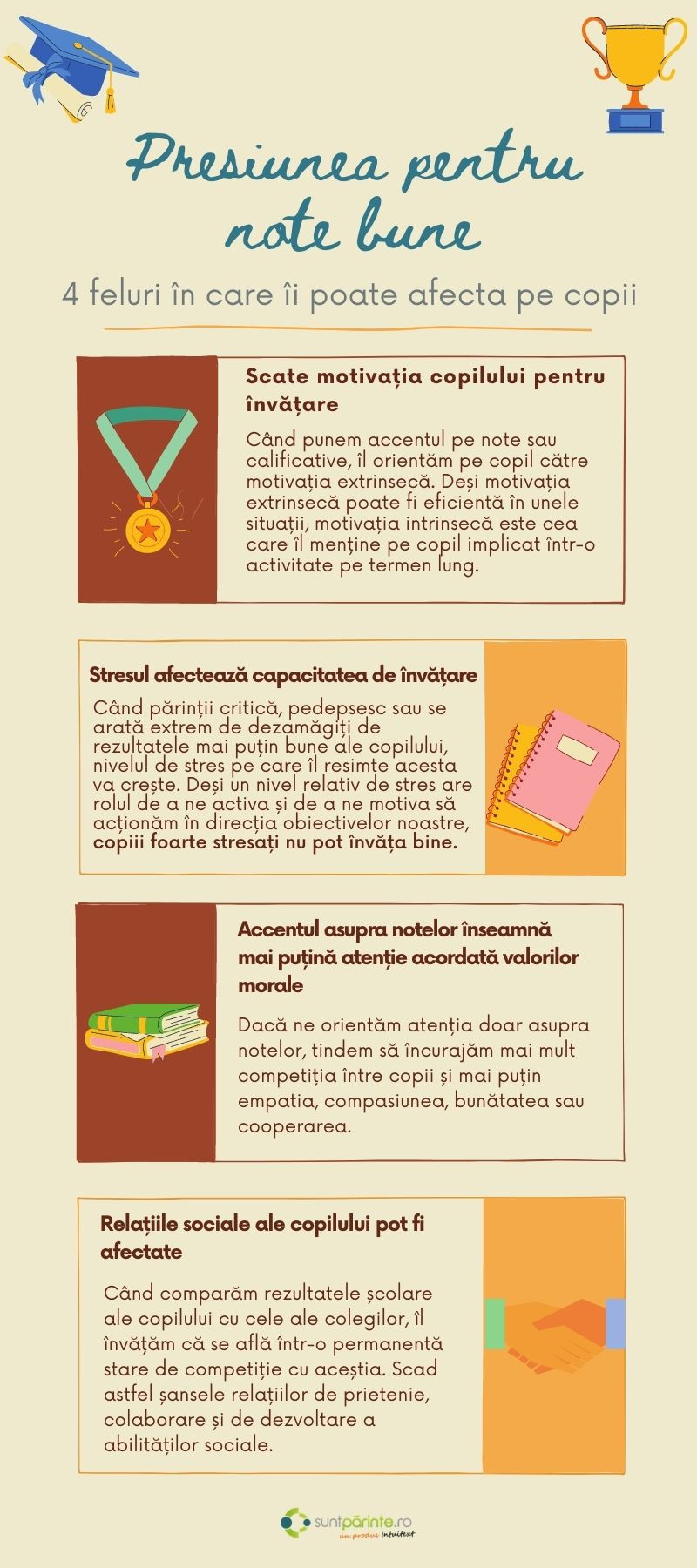 Când părinții critică, pedepsesc sau se arată extrem de dezamăgiți de rezultatele mai puțin optime ale copilului, nivelul de stres pe care îl resimte acesta va crește. Deși un nivel relativ de stres are rolul de a ne activă și de a ne motiva să acționăm în direcția obiectivelor noastre, copiii foarte stresați nu pot învață bine. Așadar, cu cât părinții creează presiune mai mare pentru note bune, cu atât șansele de a obține un efect pozitiv asupra copilului vor scădea.