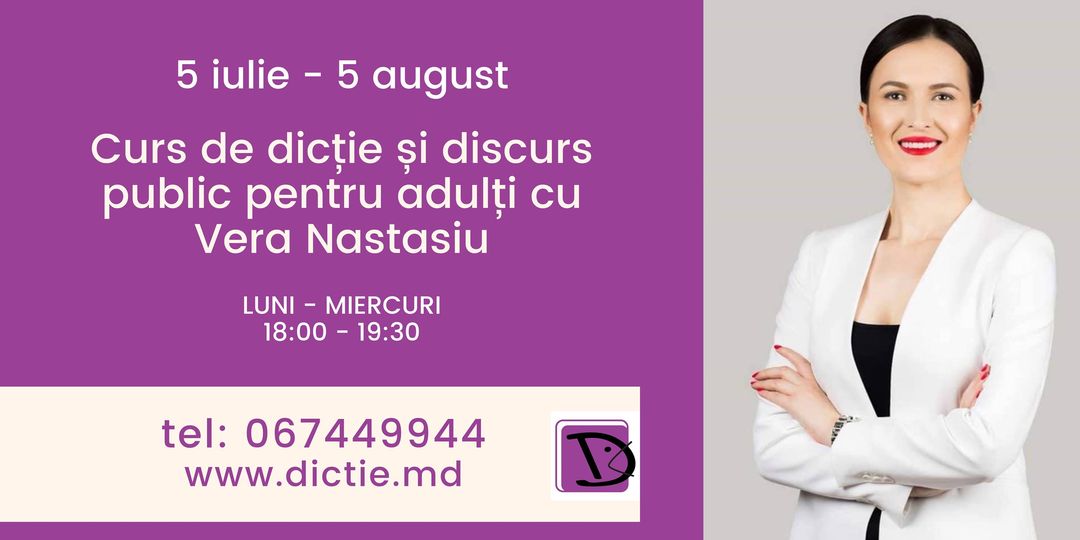 Îţi doreşti să devii un comunicator de succes sau pur şi simplu un om care să aibă încredere în sine şi să vorbească frumos, clar și coerent? Dacă răspunsul este unul afirmativ, atunci acum e momentul să te înscrii la cursul de Dicție și Discurs public cu Vera Nastasiu, care începe din 5 iulie.