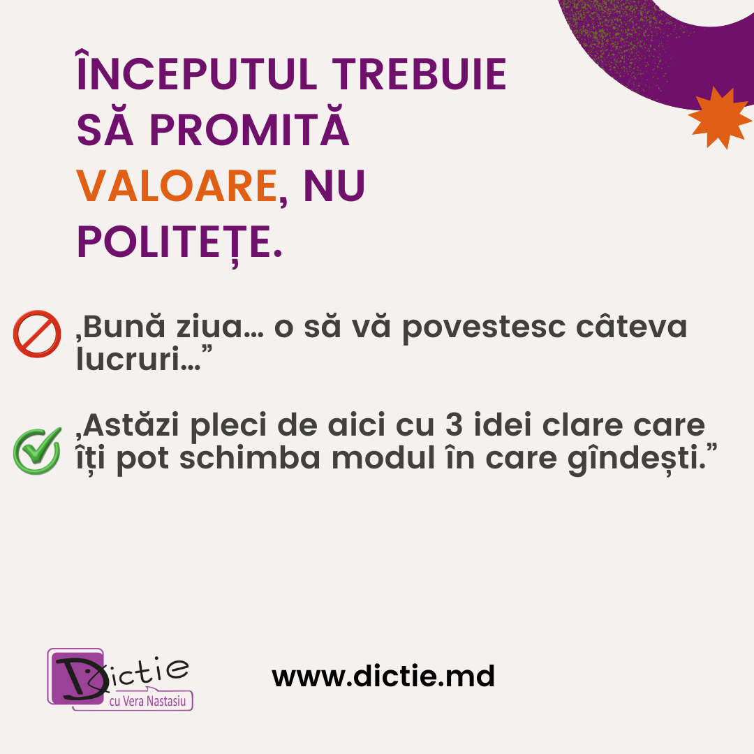 👉 Un discurs bun începe cu promisiune, nu cu introducere.