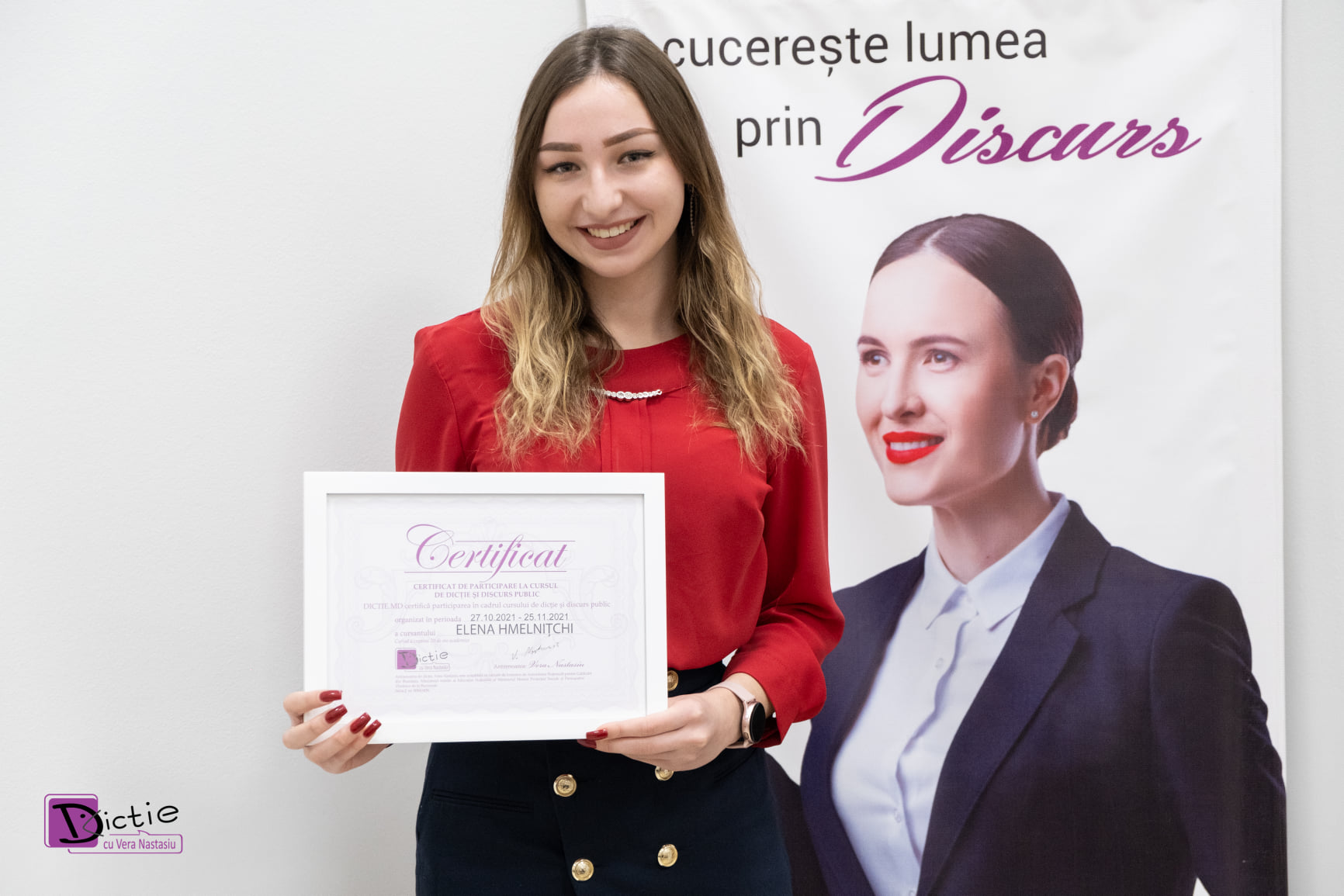 Deținerea abilităților de comunicare reprezintă un talent care poate fi dobândit prin muncă, iar cei mai harnici învață rapid cum să conducă textul, pentru ca textul să nu-i conducă pe ei. Elena Hmelnițchi, studentă la medicină, a fost interesată de activitatea noastră și după o lungă perioadă de urmărire pe rețelele de socializare, s-a înscris la cursul pentru adulți cu Vera Nastasiu.