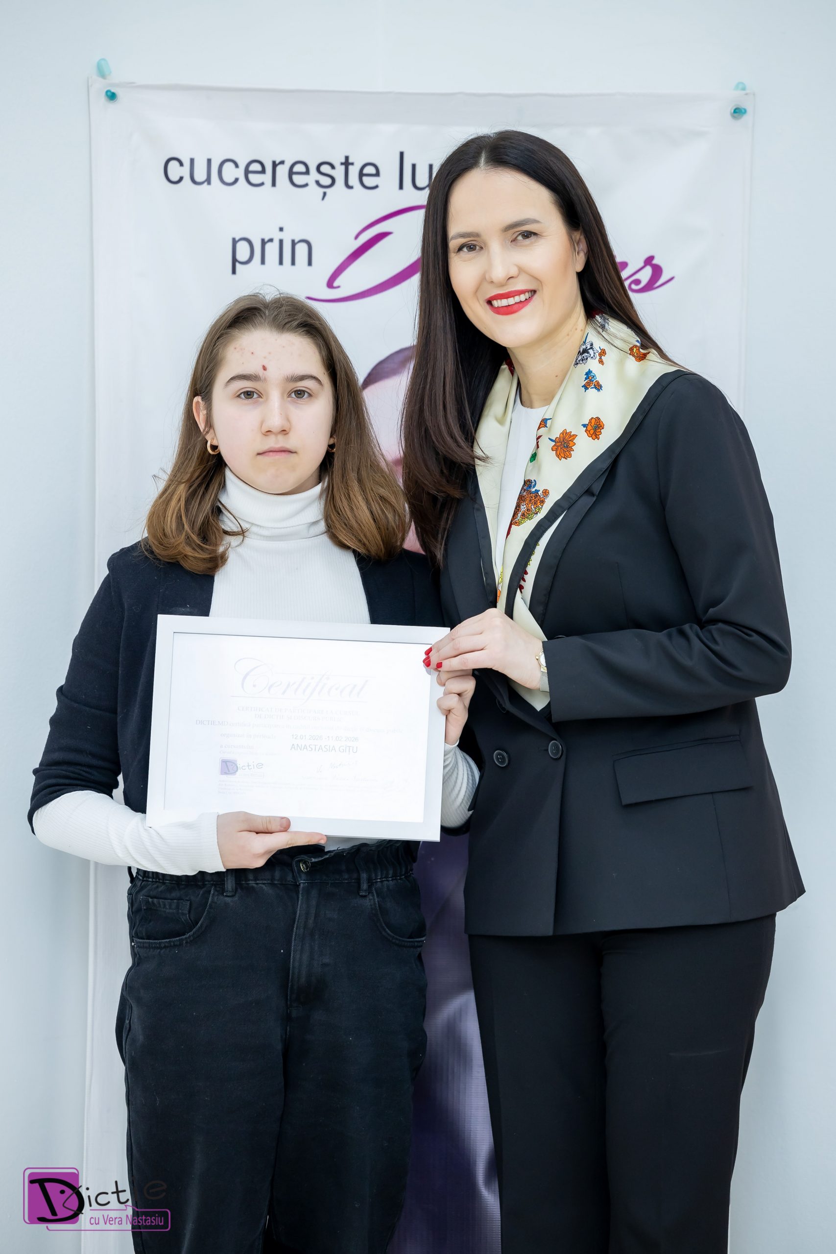 Sergiu, Anastasia, Ștefan Cristian, Ludmila, Corina, Gloria, Maria, Roberta și Dumitru au parcurs un drum care nu a fost despre perfecțiune instantanee, ci despre progres vizibil de la o lecție la alta. Au învățat să respire corect, să articuleze clar, să-și construiască discursurile logic și să-și susțină ideile fără ezitare. Au repetat, au corectat, au reluat. Au muncit.