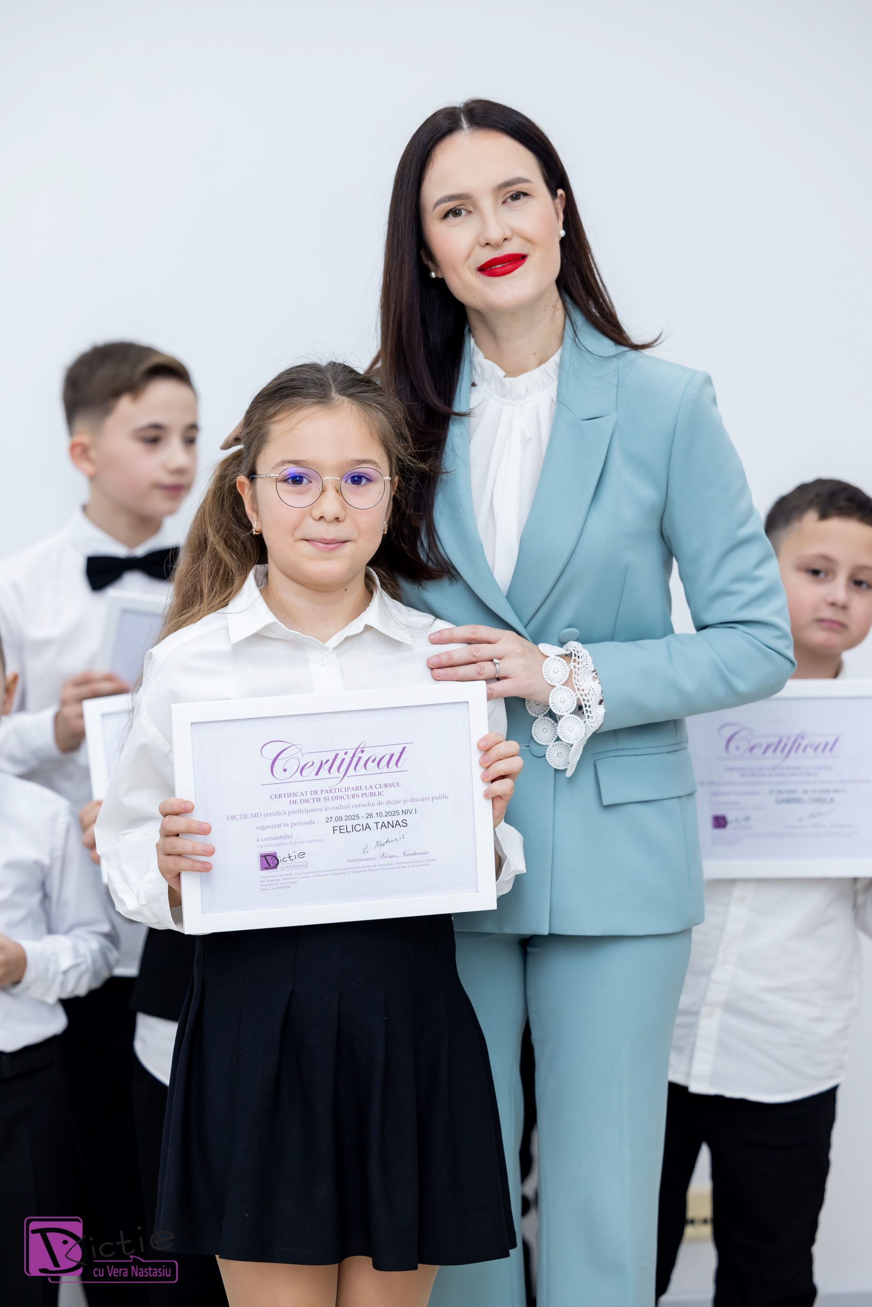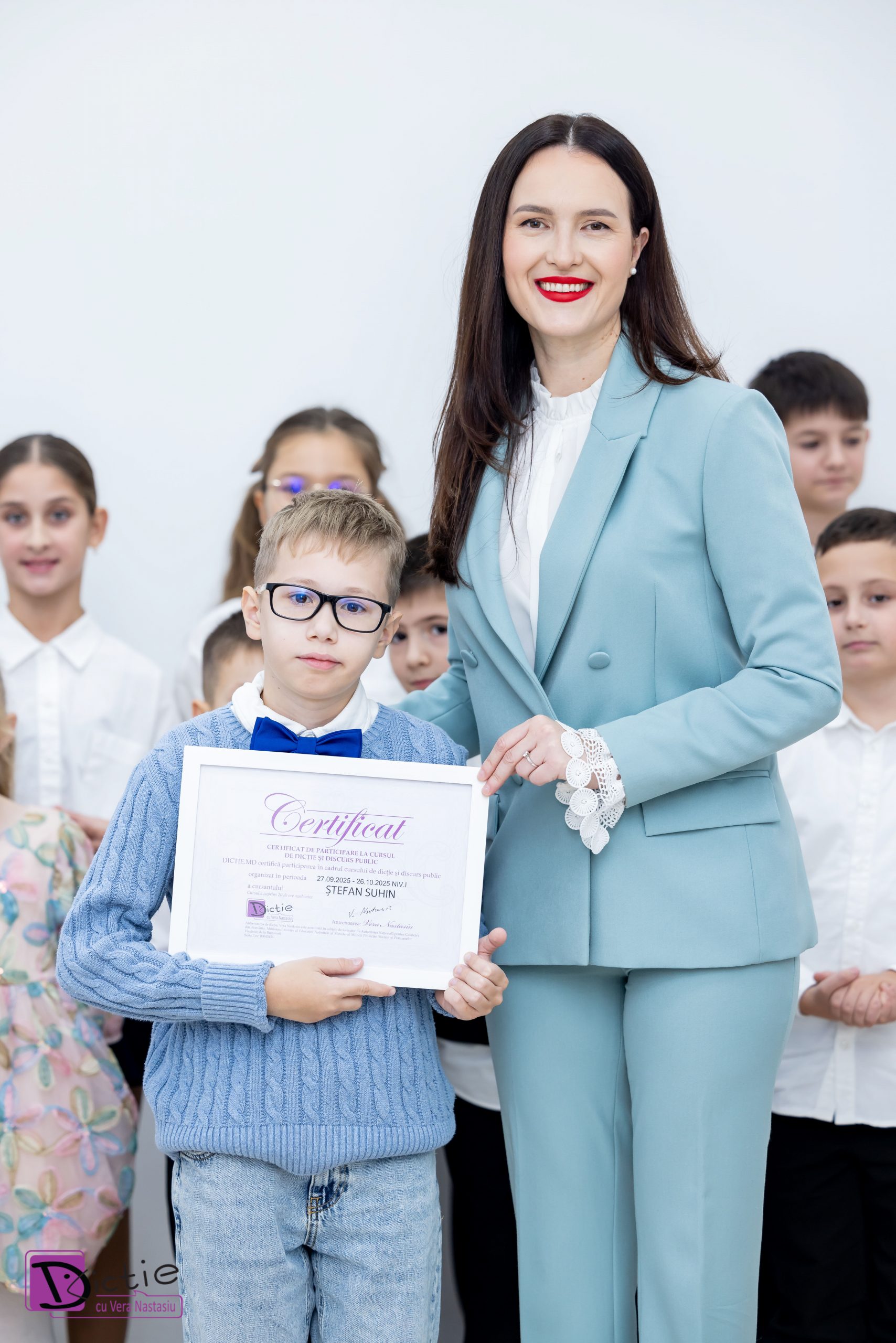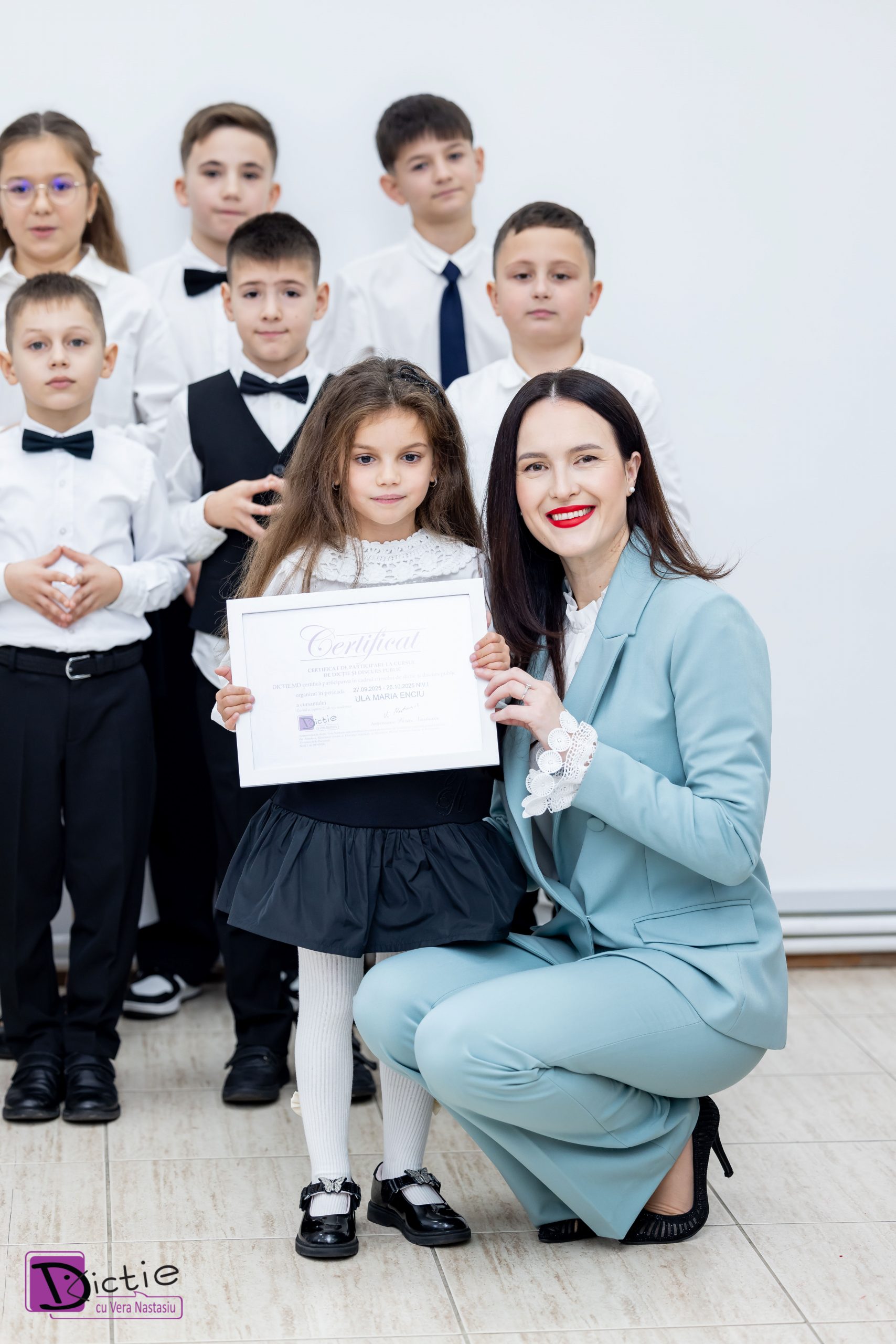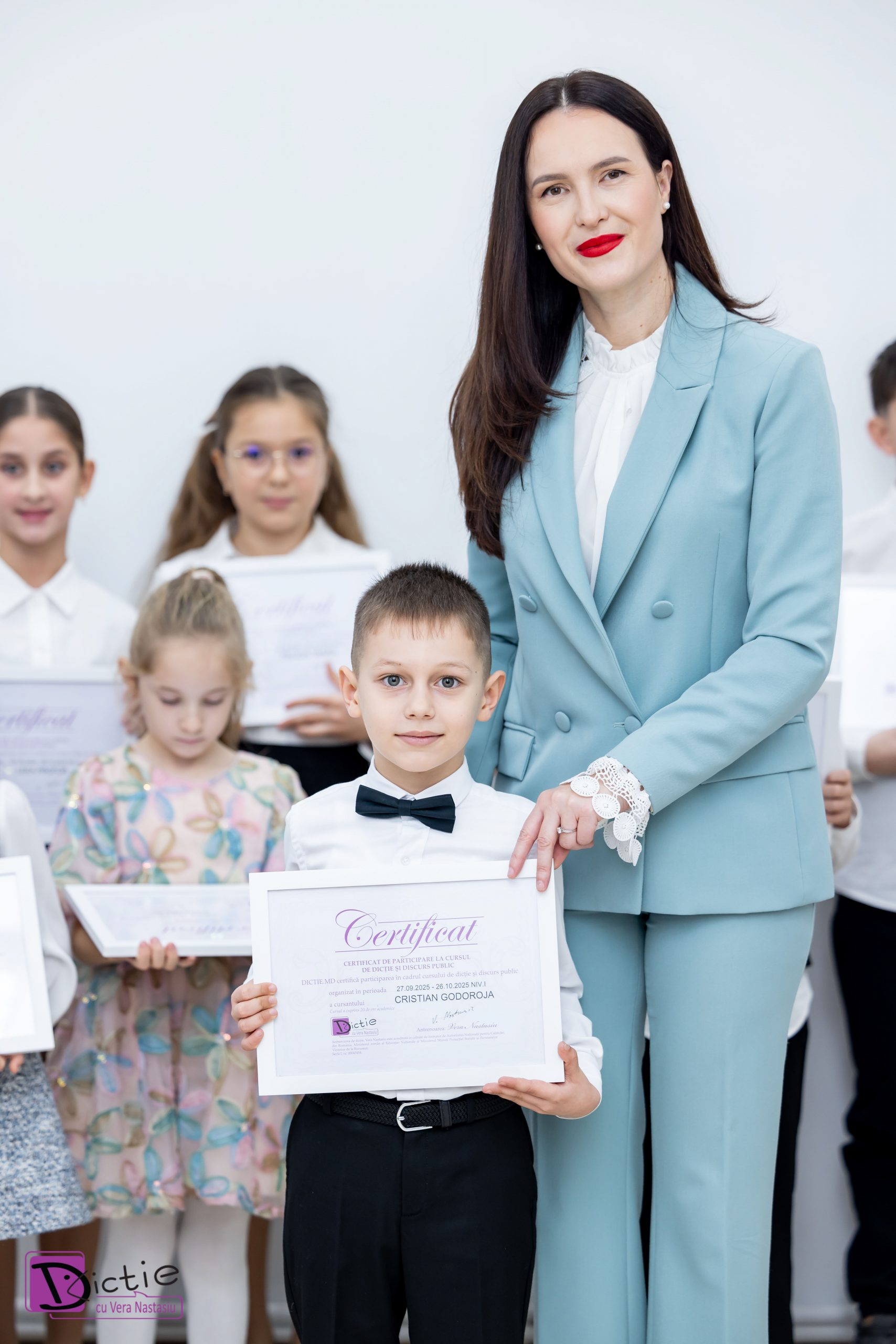 Vera Nastasiu a lucrat individual cu fiecare copil. Voci diferite, vârste diferite, ritmuri diferite — dar un singur obiectiv: să îi ajute să prindă curaj, să își descopere vocea interioară și să învețe arta de a comunica frumos, cu dicție, cu energie, cu sens.
