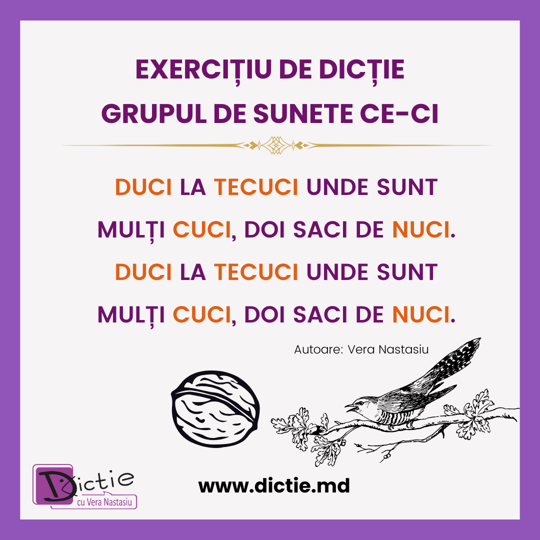 Ne concentrăm pe sunetele CE și CI, care se formează cu vârful limbii (apexul) sus, spre cerul gurii, și cu buzele împinse ușor în față.