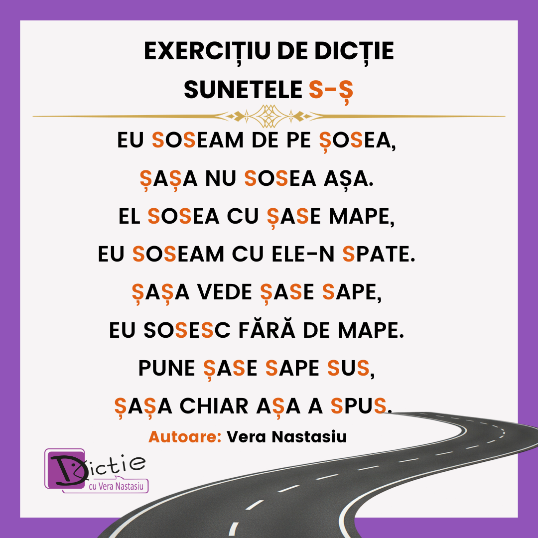 Rostește exercițiul semnat de Vera Nastasiu de 5 ori, accelerat. Observă atent: unde se încurcă sunetele? Unde se „înghit” consoanele? Unde respirația te trădează?