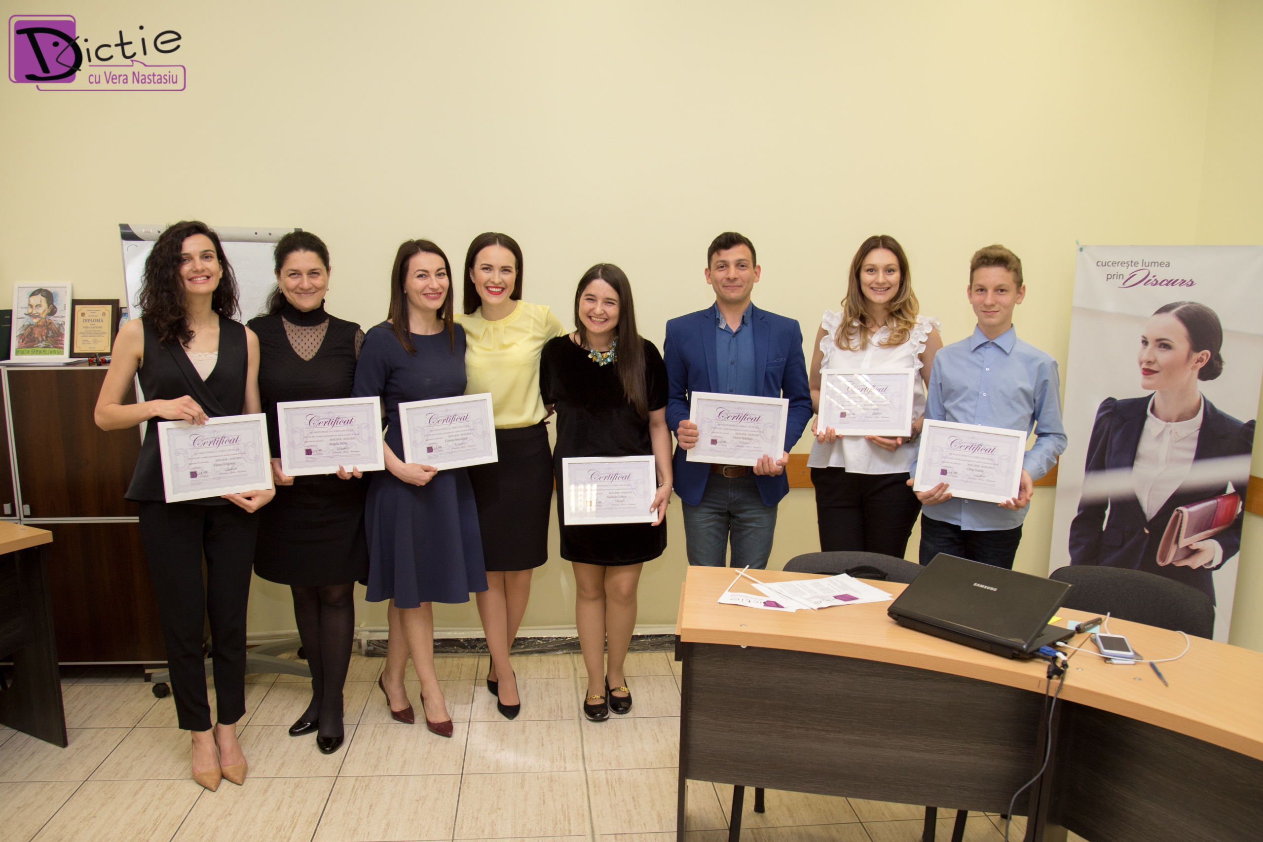 Victoria Cibotaru: ” În primul rind vreau sa multumesc Verei Nastasiu si echipei Dictie ca am fost acceptata sa fac parte dintr- o echipa de oameni inteligenti. Am avut parte de o atmosfera calda si pozitiva de lucru.Am invatat cum sa imi construiesc cap- coada un discurs public, cum sa imi controlez emotiile, timbrul vocii si sa fiu mai persuasiva intr- un discurs. Am invatat cum sa maschez emotiile si sa fiu ascultata si mai convingatoare, ceea ce ma va ajuta in profesia de meneger.Si nu in ultimul rind in rolul de mama am obtinut performante prin limbajul copiiilor (baietilor mei) , pentru ca copiii sunt – oglinda noastra , a parintilor . Cinci saptamini au trecut foarte rapid, mi- a placut mult asa ca n- o sa ezit sa ma inscriu si la al doilea nivel.Imi plac provocarile si abia astept sa vad ce ne pregateste Vera Nastasiu pt nivelul doi. Va multumesc!”