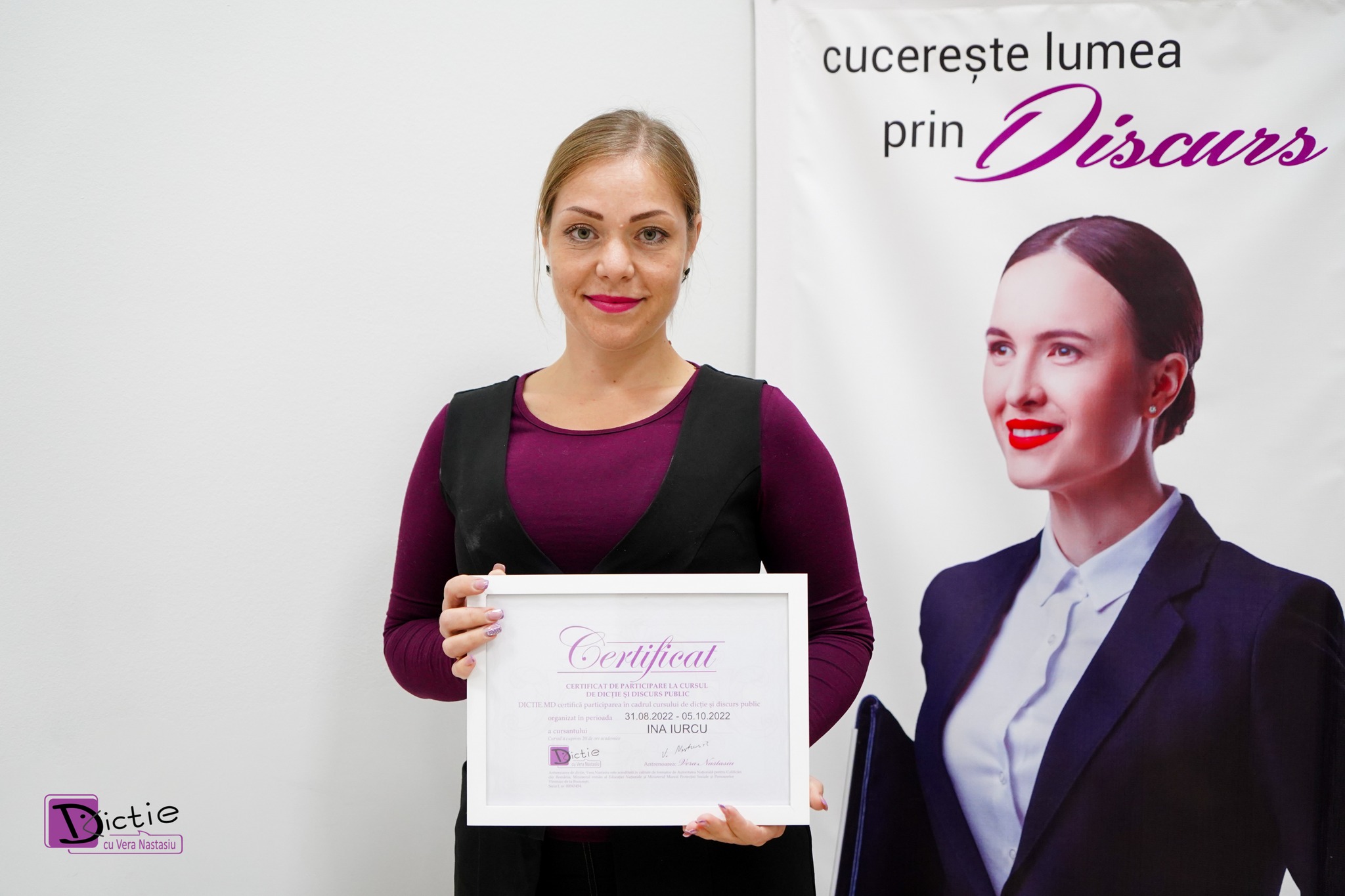Fiecare dintre noi avem propria călătorie spre cea mai bună versiune a noastră. Această călătorie este una dinamică și schimbarea are loc, prima oară, în interior și abia apoi în exterior. Interiorul creează exteriorul și nu invers. Doamna Ina Iurcu a hotărât că este timpul pentru a fi și mai bună în domeniul ei de activitate, iar pentru a deveni cea mai bună versiune a ei a decis să înceapă să învețe să comunice mai bine, mai corect și mai eficient. Astfel, a ajuns la cursul nostru de Dicție și Discurs public.