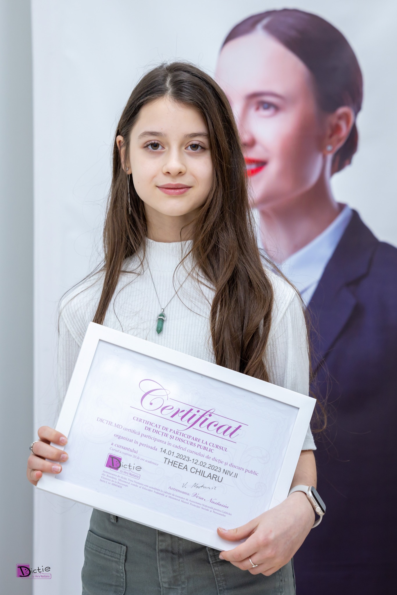 Theea este o fetiță deșteaptă, frumoasă și extrem de implicată în fiecare lucru pe care-l face. A revenit în sala de curs la Dicție cu Vera Nastasiu după 4 ani la nivelul avansat al acestui curs. Am lucrat împreună și rezultatele ei sunt cu adevărat remarcabile.
