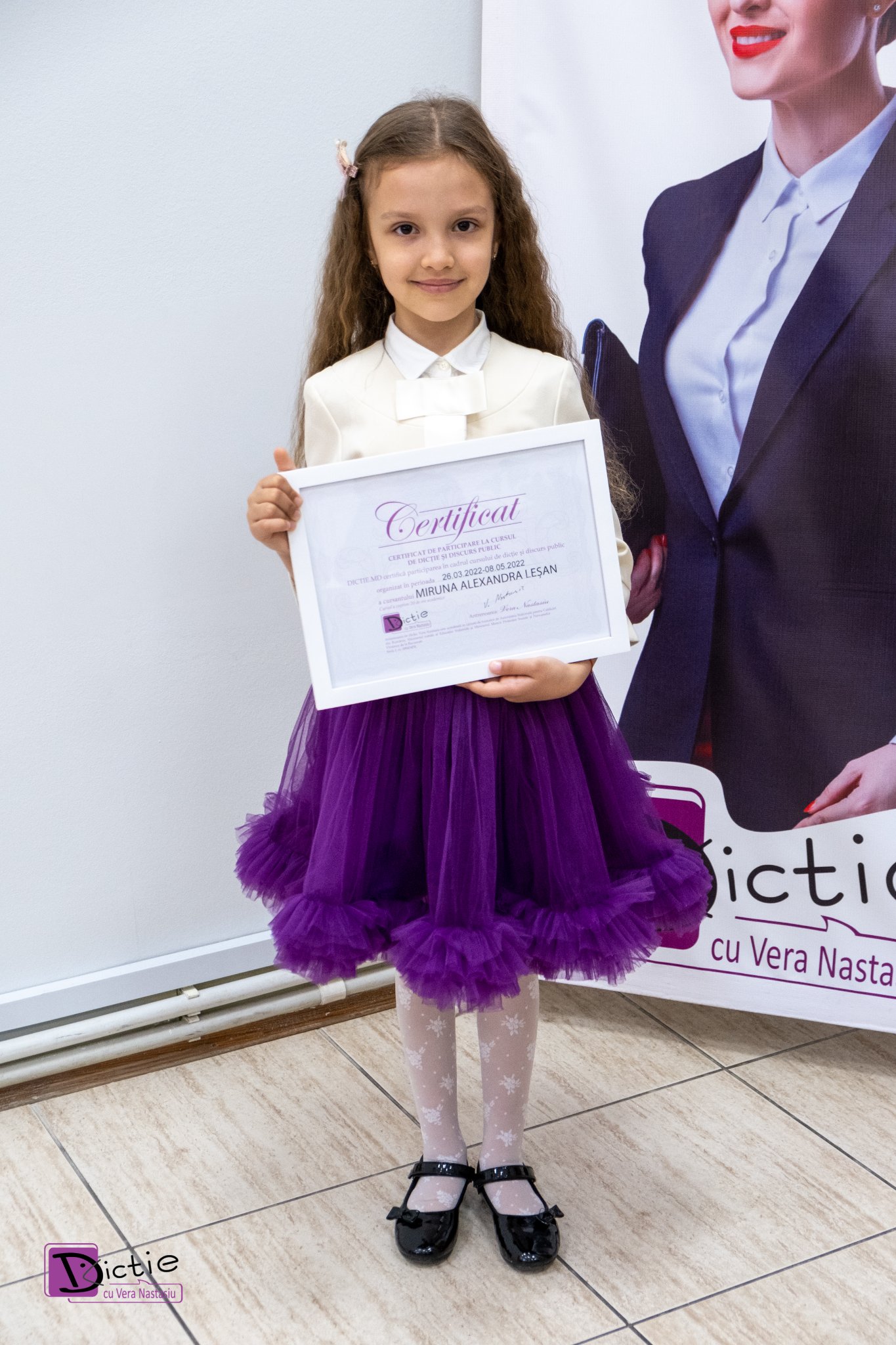 O analiză amplă a demonstrat că un nivel ridicat de încredere în sine este asociat cu o stare de sănătate mai bună, viață socială mai bună, predispoziție scăzută a tulburărilor mintale și a problemelor de tip social, reziliență și bunăstare mentală. Copiii cu încredere de sine prezintă performanțe ridicate la scoală și, în viața de adult, au parte de satisfacție profesională mai puternică. Natalia Leșan,  mama cursantei noastre Miruna Leșan, a observat că fata ei are nevoie să dobândească încredere în sine pentru a-și putea valorifica potențialul la maximum. Acest lucru a determinat-o să o înscrie la lecțiile de Dicție și Discurs Public cu Vera Nastasiu.