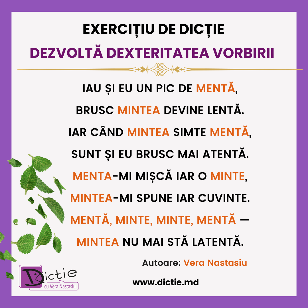 Repetiția controlată a cuvintelor „mentă” și „minte” obligă vorbitorul să nu alunece în pronunție superficială. Fiecare silabă trebuie susținută. Fiecare sunet trebuie închis corect. Fiecare pauză trebuie gândită.