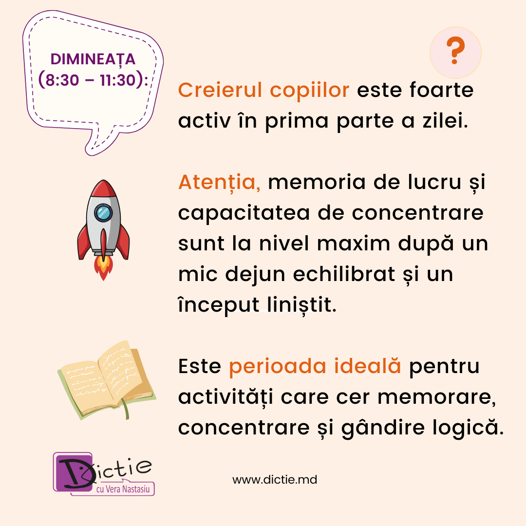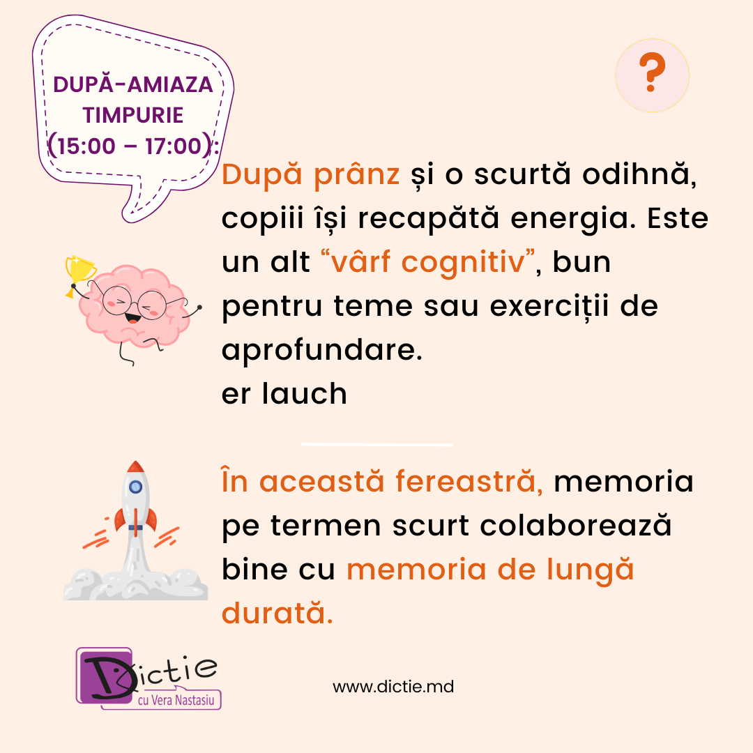 Pentru copii, aceste vârfuri sunt esențiale: atunci când lucrăm cu ei la cursurile de dicție și discurs public cu Vera Nastasiu, alegem exercițiile solicitante exact în aceste ferestre de timp, pentru ca rezultatele să fie maxime.