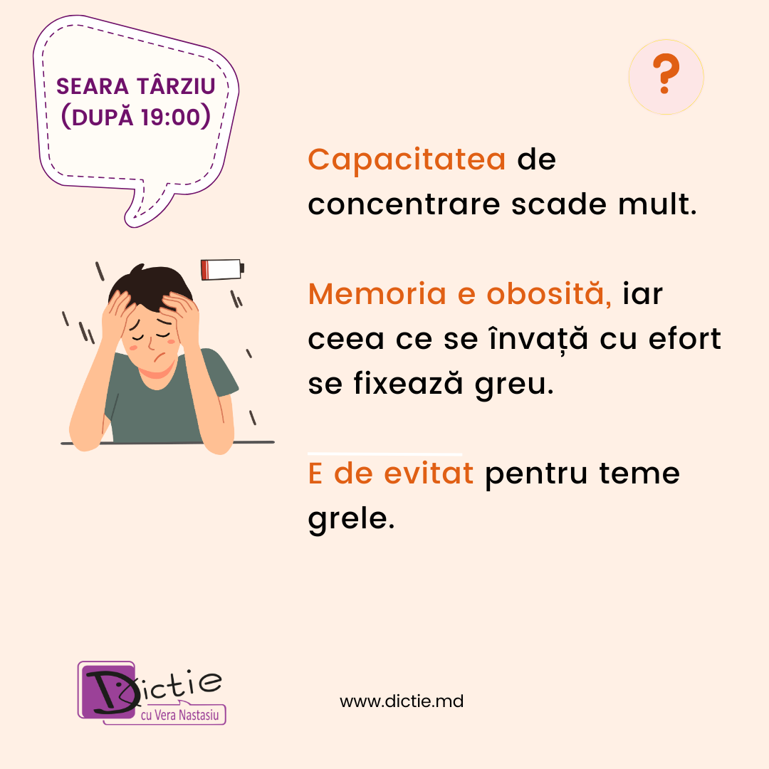 🔸 Seara (după 19:00) – Capacitatea de concentrare scade, memoria este obosită și ceea ce se învață atunci se fixează mai greu. Temele făcute seara târziu devin mai mult o luptă cu oboseala decât o experiență de învățare eficientă.