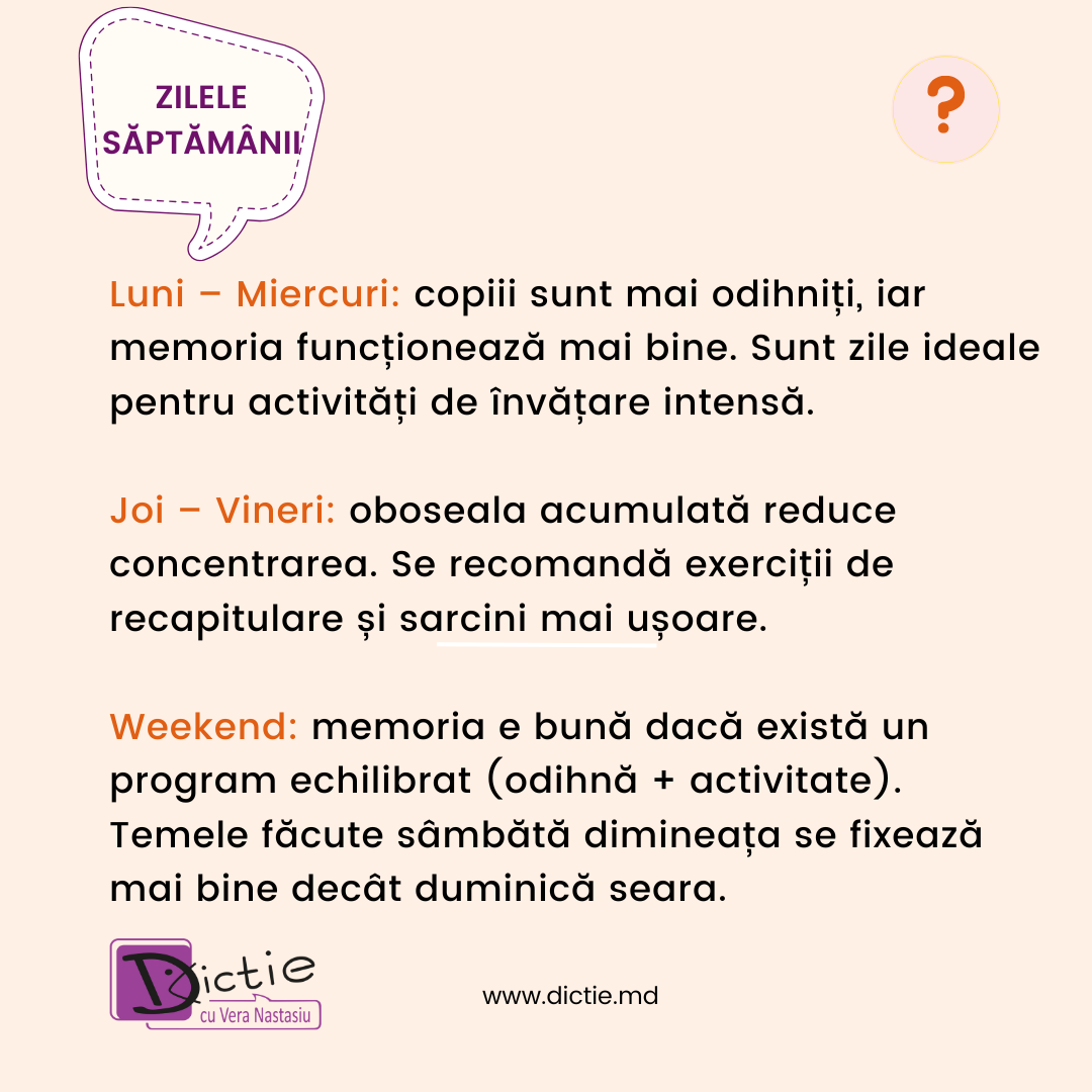 Luni, marți și miercuri, memoria este mai activă și copiii sunt mai proaspeți. Spre sfârșitul săptămânii, oboseala acumulată se simte. În weekend, sâmbăta dimineața este excelentă pentru teme sau activități cognitive, pe când duminica seara nu este recomandată.
