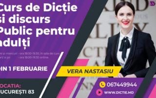 1 februarie – Curs de DICȚIE ȘI DISCURS PUBLIC pentru adulți și adolescenți. Luni - Miercuri - 18.00-19.30 - SALA DE CURS MARȚI - JOI - 18.00-19.30 - ONLINE Detalii la +373 67 44 99 44 Cursul durează 5 săptămâni. #Instruiri moderate de #Vera #Nastasiu, antrenoare acreditată ANC București pe poziția de formator, licențiată în științele educației, masterandă în comunicare și relații publice, SNSPA BUCUREȘTI, masterandă în științe politice [...]