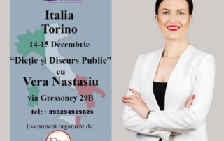 În perioada 14-15 decembrie, antrenoarea de dicție și discurs public, Vera Nastasiu îți dă întâlnire la Torino, acolo unde va modera un curs de dicție și discurs public pentru cei care își doresc să obțină noi performanțe în arta comunicării. Dacă te afli la Torino, ești pasionat de oratorie și îți dorești să înveți cum îți poți antrena ritmul vorbii, volumul vocii, respirația, tonalitata dar și [...]