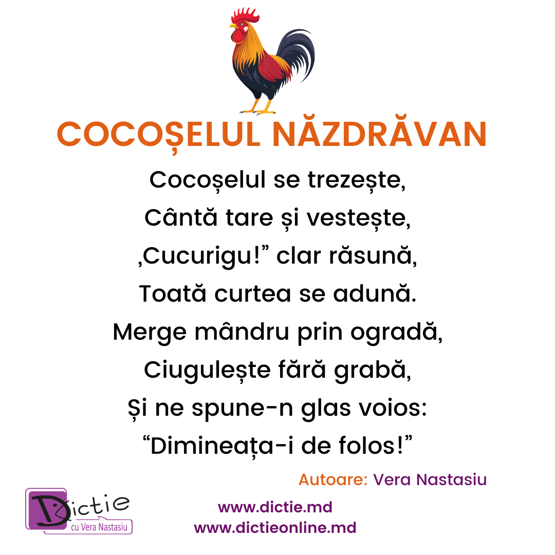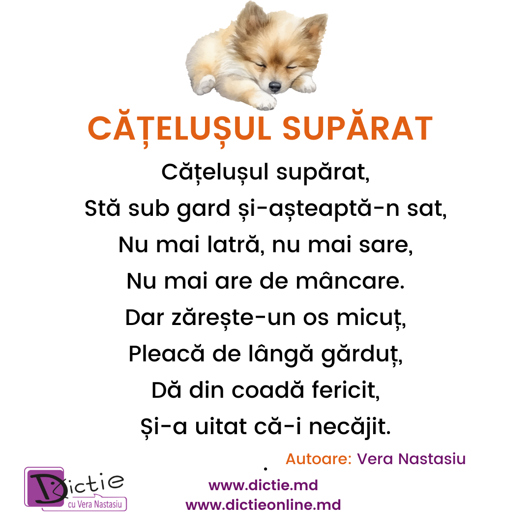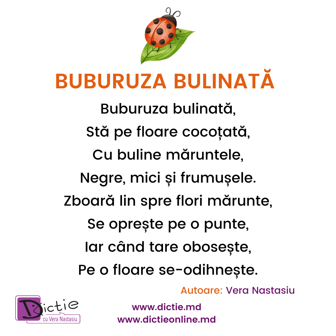 Fiecare poezie este un mic exercițiu de dicție.Fiecare vers este un pas spre o vorbire mai clară.Dragi părinți, opriți-vă puțin din grabă. Stați lângă copil. Ascultați-l. Repetați împreună.Pentru că vorbirea nu se grăbește…se formează, zi de zi.