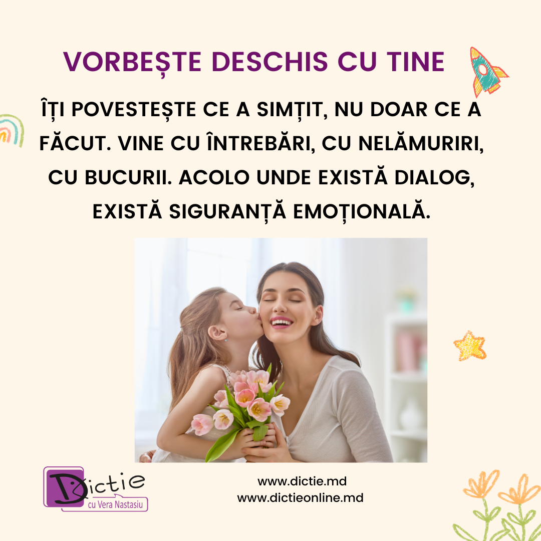 Îți povestește ce a simțit, nu doar ce a făcut. Vine cu întrebări, cu nelămuriri, cu bucurii. Acolo unde există dialog, există siguranță emoțională.