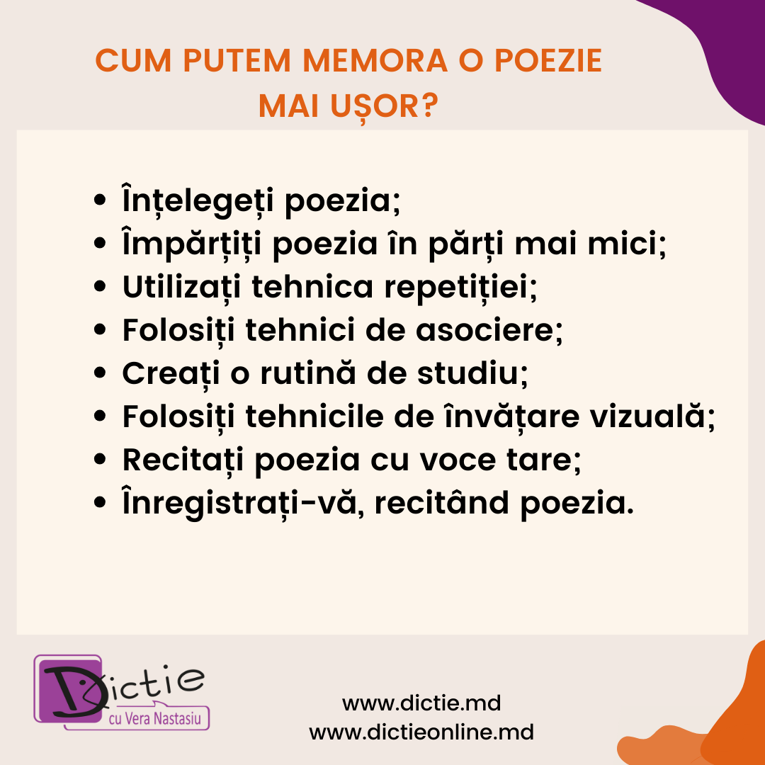 - Creați o rutină de studiu: Stabiliți un program de studiu regulat pentru a vă dedica memorării poeziei. Repetarea în timp este mai eficientă decât memorarea intensivă într-o singură sesiune.