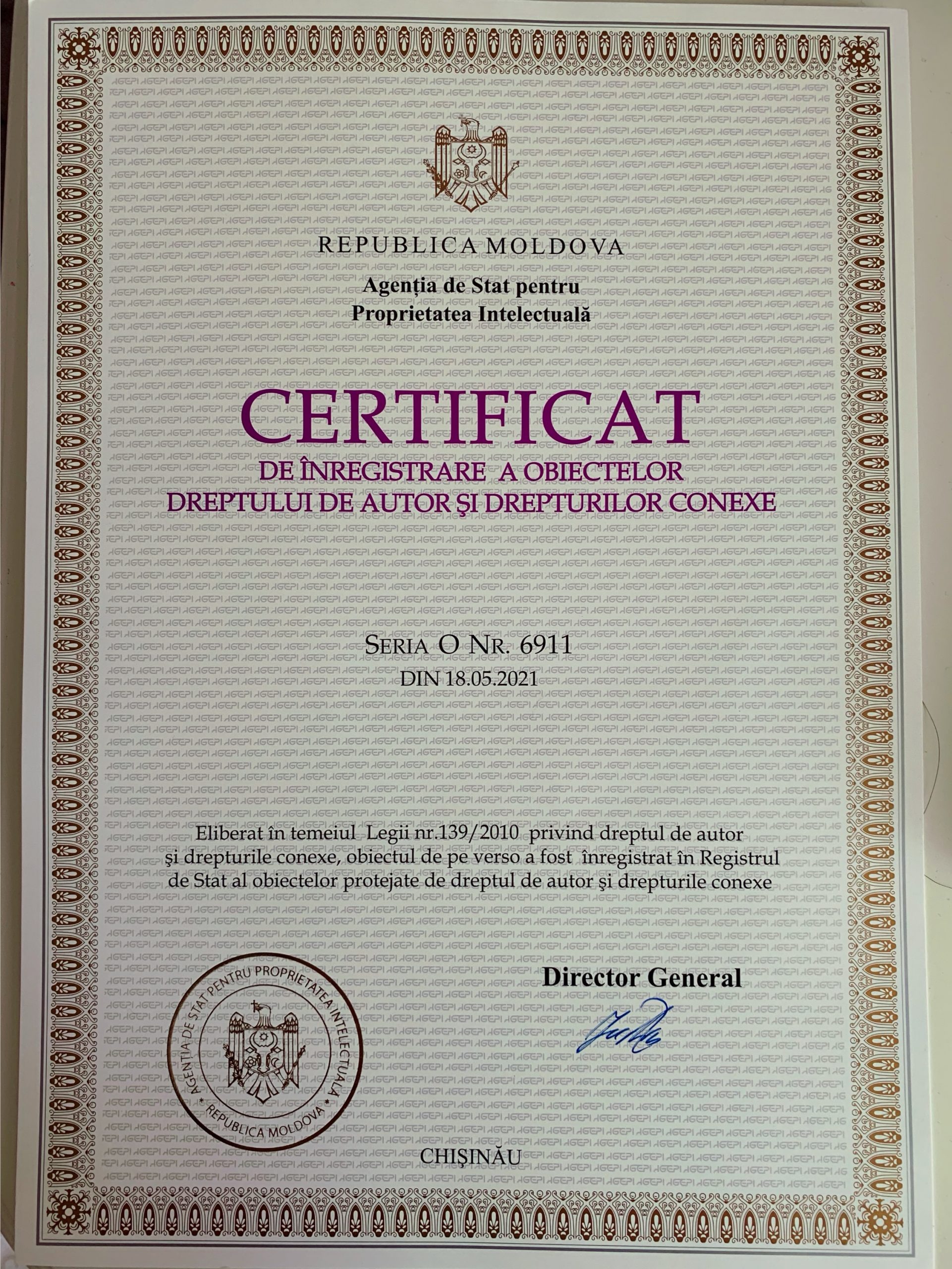 Potrivit AGEPI, în urma examinării cererii de înregistrare a operei științifice cu denumirea „Exerciții de dicție”, au fost înscrise datele cu privire la înregistrarea operei sus menționate în Registrul de Stat al obiectelor protejate de dreptul de autor și drepturile conexe, și a eliberat Certificatul de înregistrare Seria O nr. 6911 din 18.05.2021.