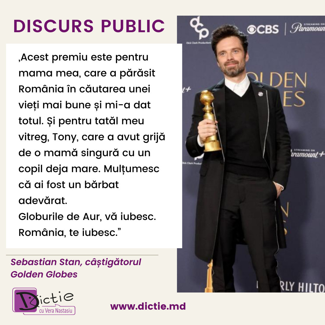 Sebastian Stan la Globurile de Aur: un discurs emoționant și puternic despre toleranță, incluziune și recunoștință, spune autoarea și antrenoarea de dicție și discurs public Vera Nastasiu.