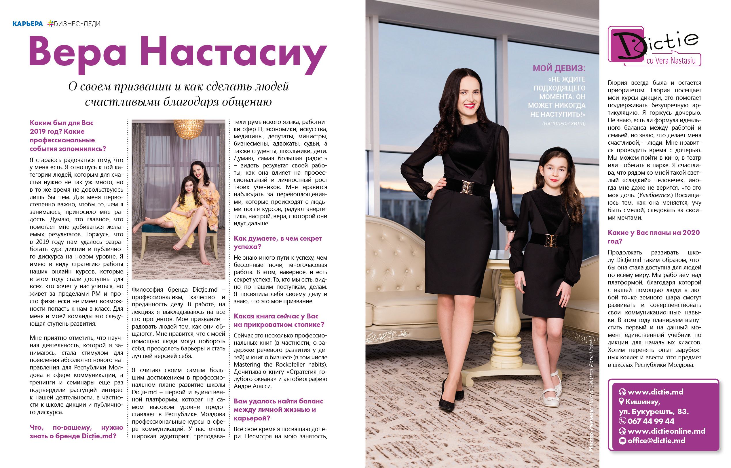 Interesul meu principal a fost să fiu fericită cu ceea ce am. Sunt omul care se mulțumeste cu puțin. Dar nu se multumeste cu orice. Iată de ce, fiecare activitate a mea, am căutat să-mi aducă mai întâi fericire și apoi implinire profesională. Așa poți costrui tot ce îți dorești cu adevărat în viață. În 2019, am dezvoltat și am eleborat cursul de dicție și discurs public la un alt nivel. Pentru mine și echipa mea acest next level se concretizează prin rezultate vizile în 2020. Aici mă refer la strategia de lucru pentru cursul online pe care îl oferim în acest an tuturor celor care trăiesc în afara țării, dar nu pot ajunge fizic în sala mea de curs. Totodată, munca mea științifică din 2019 va aduce o noutate absolută pentru Republica Moldova pe dimensiunea comunicării, iar training-urile din țară și din afara țării au confirmat interesul tot mai mare pentru școala mea de dicție.