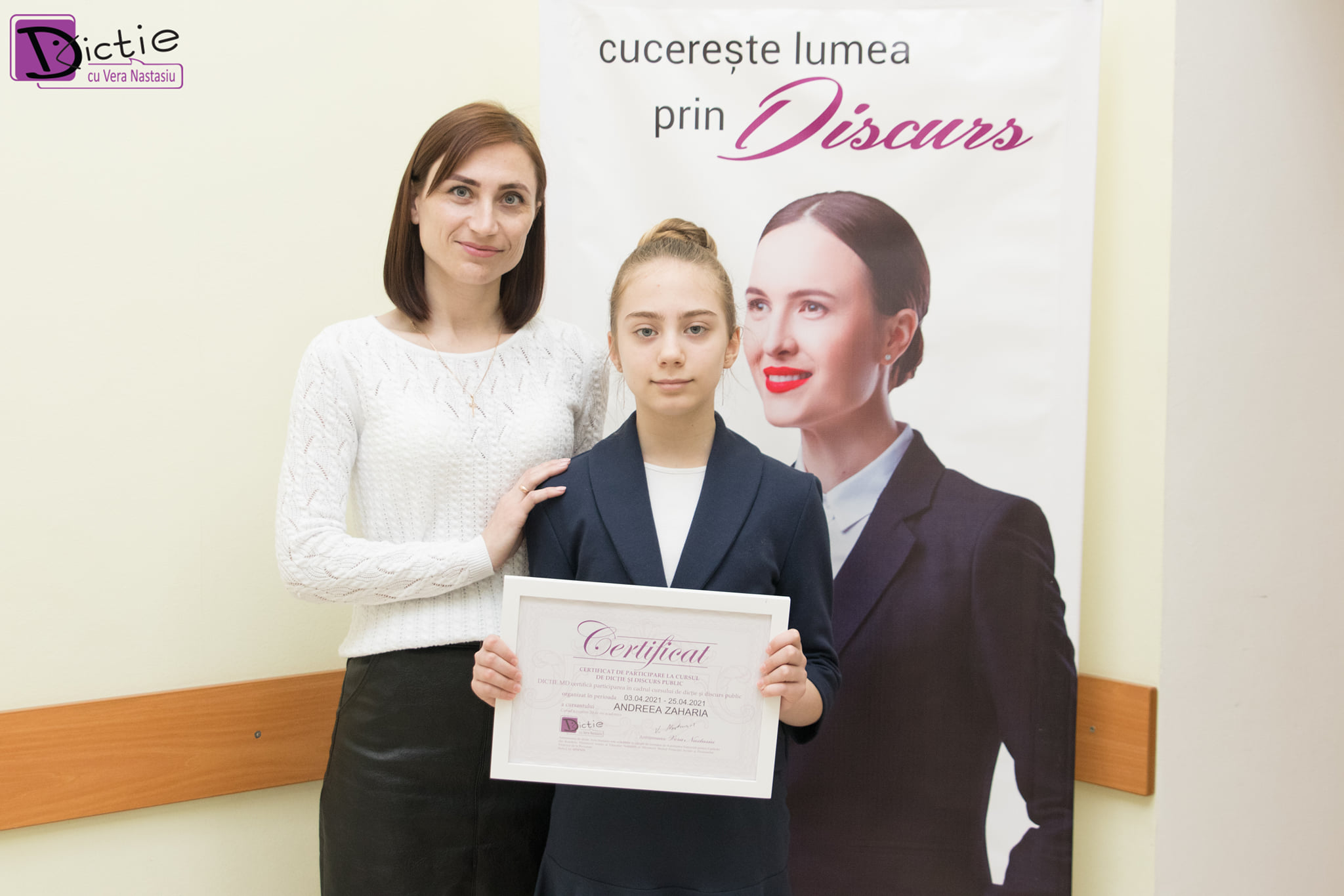care începe să se dezvolte încă din copilărie. Un copil cu o stimă de sine scăzută riscă să crească lipsit de încredere, curaj și putere. Riscă să accepte provocările cu dificultate. Iată de ce este bine ca un copil să învețe să aibă încredere în sine și să fie implicat în permanență în diferite activități care l-ar ajuta să-și crească respectul de sine, ne mărturisește mama cursantei noastre Andreea Zaharia, care a excelat la capitolul dicție și discus public în cele 5 săptămâni de curs alături de antrenoarea Vera Nastasiu.